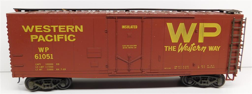 An Atlas (made in Austria) American 0 scale Western Pacific box car with Kadee couplings missing small springs to keep the couplings closed number WP 61051, fine scale wheels, in good condition, no original packaging