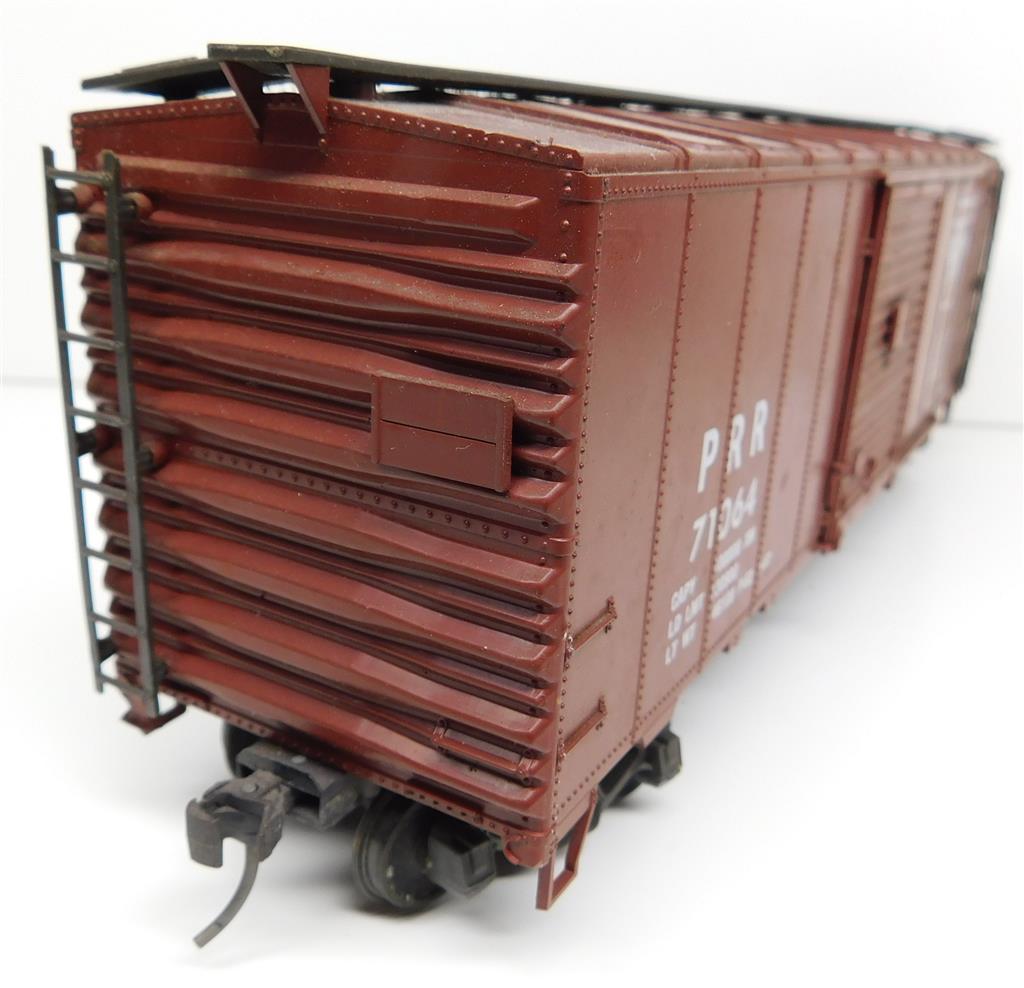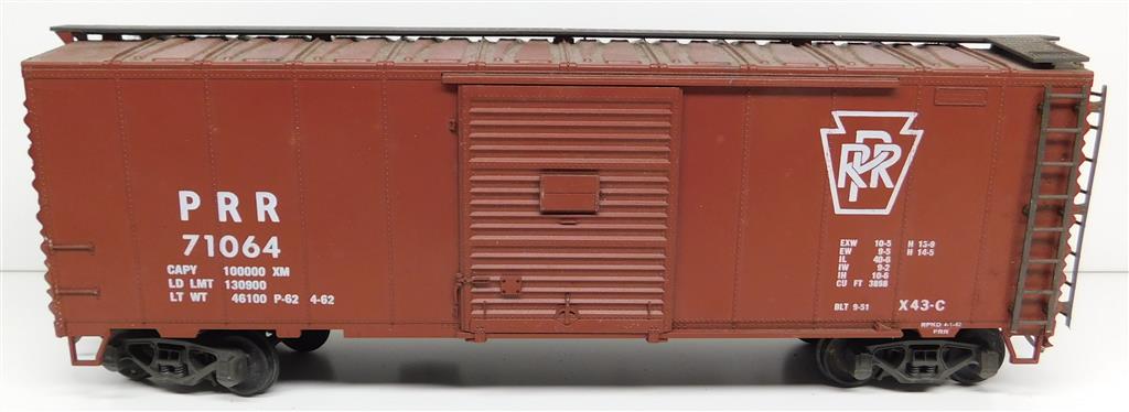 An Atlas (made in Austria) American 0 scale Pennsylvania Railroad box car with Kadee couplings missing small springs to keep the couplings closed number PRR 71064, fine scale wheels, in good condition, no original packaging