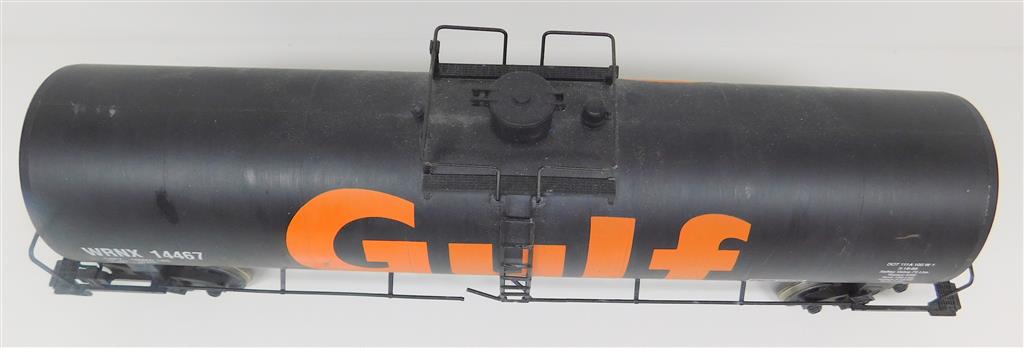 An American 0 scale 31cm long Gulf tank car with Kadee couplings number WRNX 14467, fine scale wheels, broken stay pipe and loose bogie mount one end otherwise in good condition, no original packaging