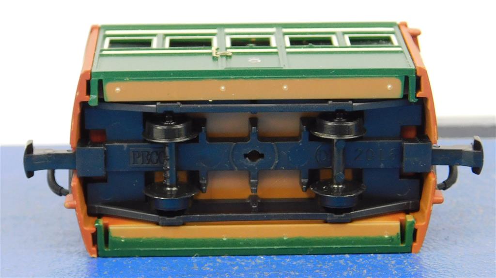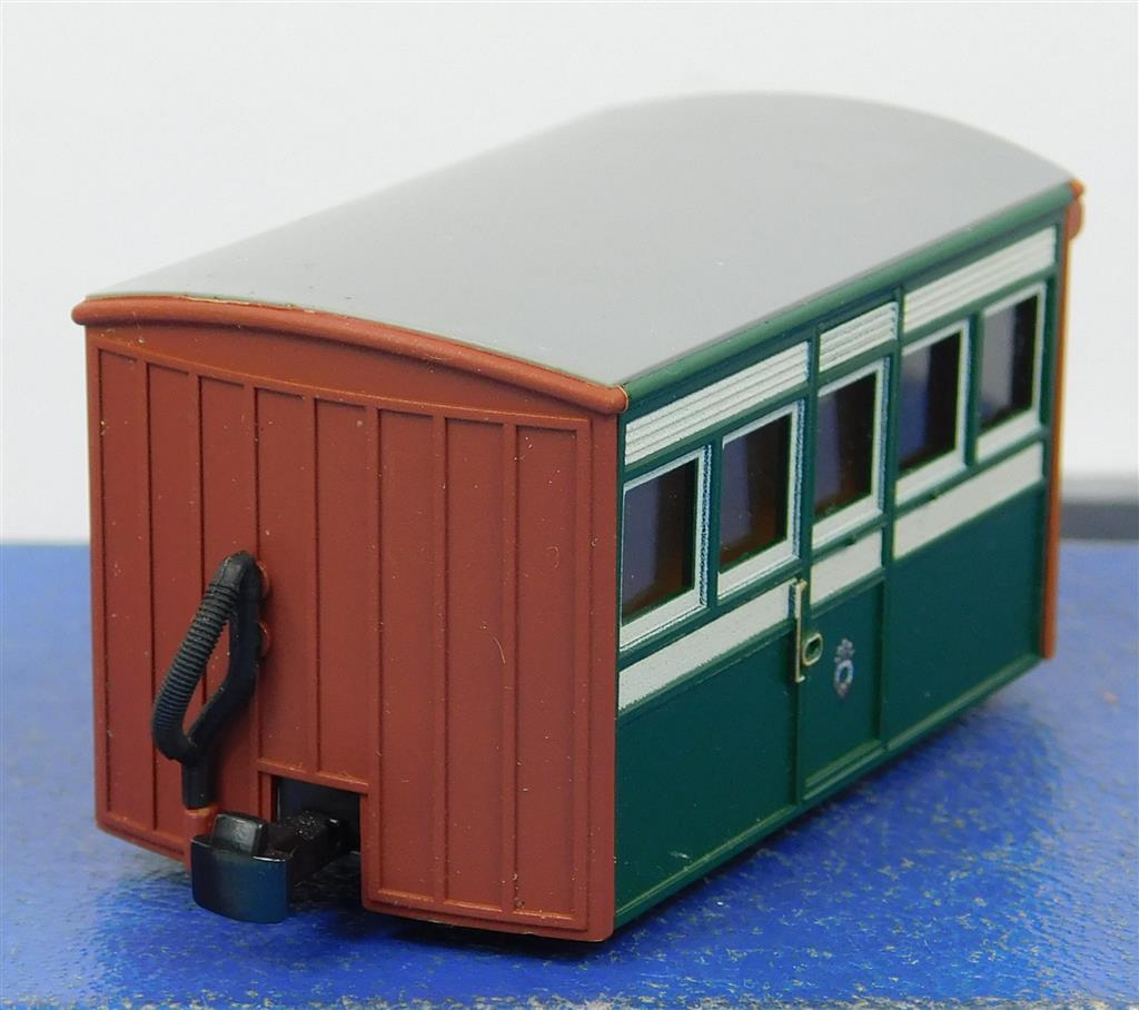 009 Narrow Gauge: Peco Ffestining Railway 4 wheel bug box coach, green, unnumbered, missing coupling loops