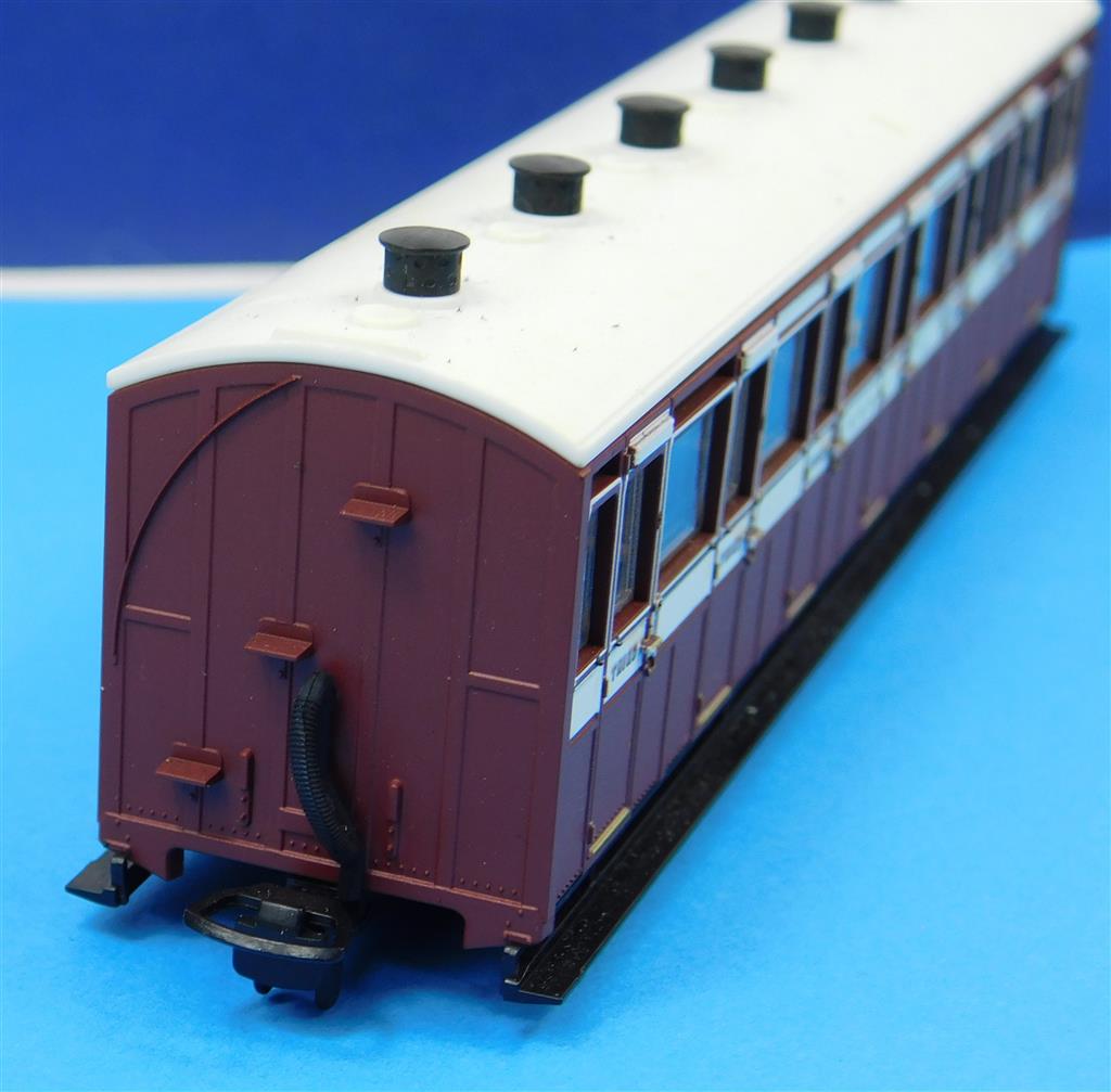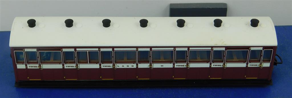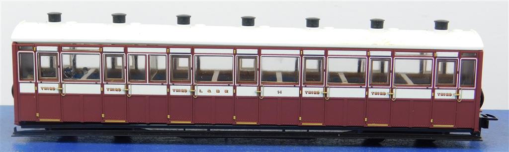 A Peco Lynton & Barnstaple (L&B) Railway 3rd class coach number 14, missing plug-in coupling one end otherwise in good condition, no original box