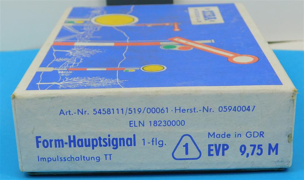 A 1970s/1980s production SIBA East German TT scale 519/00061 single arm main signal "Form-Hauptsignal FF1", solenoid works but the mechanism needs adjustment and possibly lubrication to work properly, not fitted with a light, in good condition and supplied in the original box