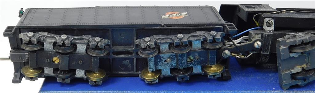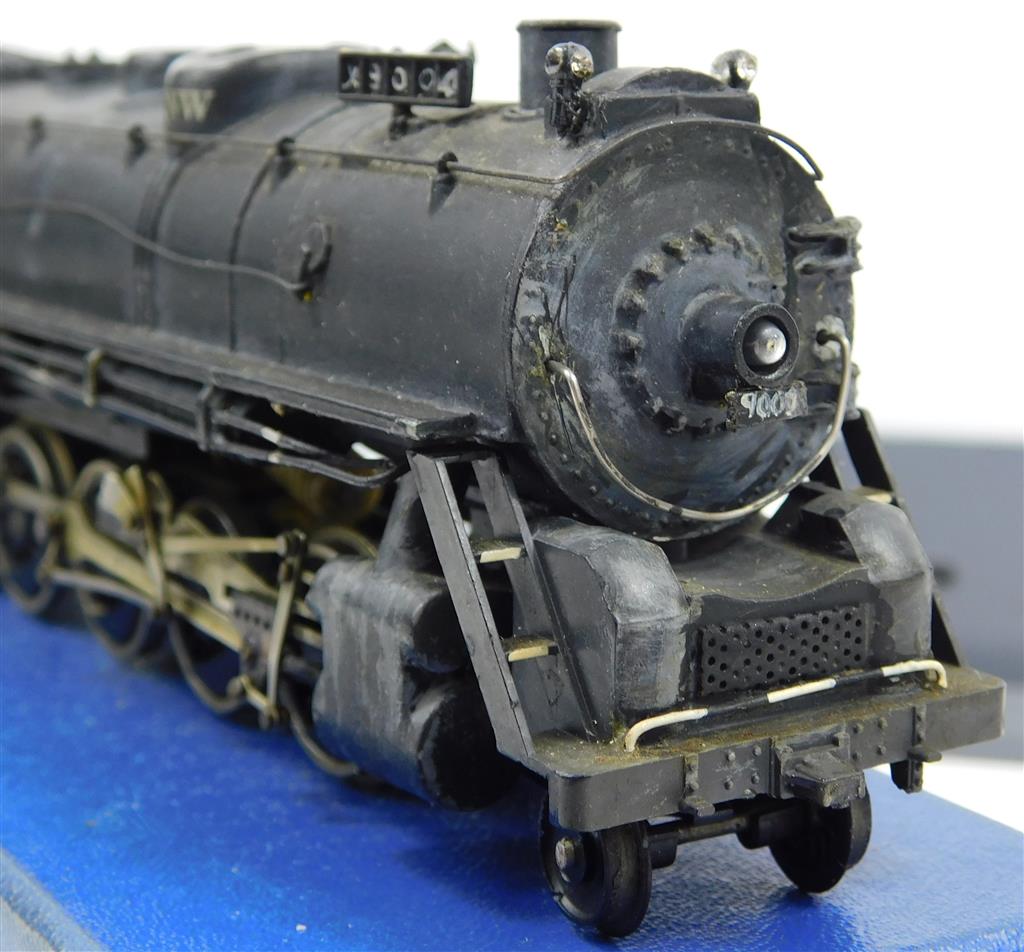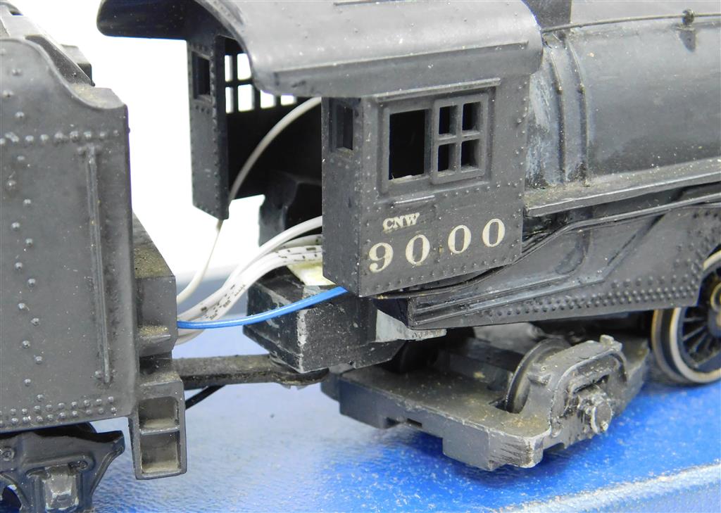 A metal bodied (heavy!) Chicago and North Western 2-8-2 number 9000, make unknown, fitted with a Throttle-up DCC chip set to code 3, reluctant runner on DCC in the wrong direction, directional headlight, does not run on DC, supplied in a Rivarossi box, repaint candidate, couplings need replacing, sold as a project