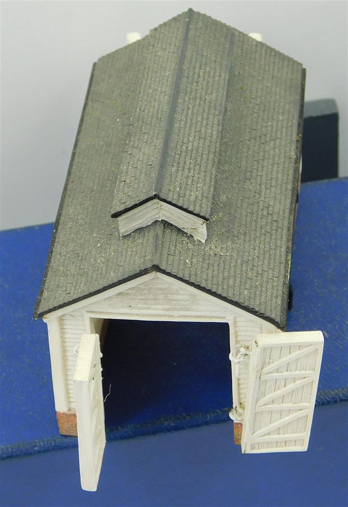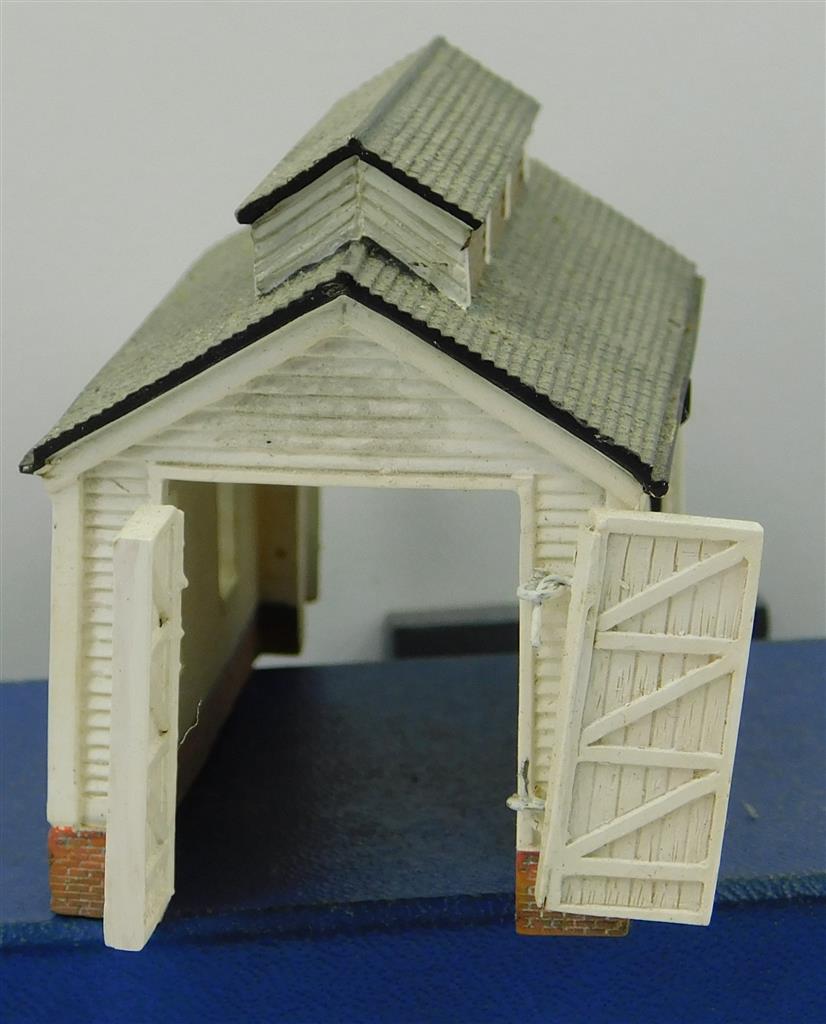 A Hornby N gauge Lyddle End small wooden design loco shed, with opening doors (crude hinges), in good used condition, no original box