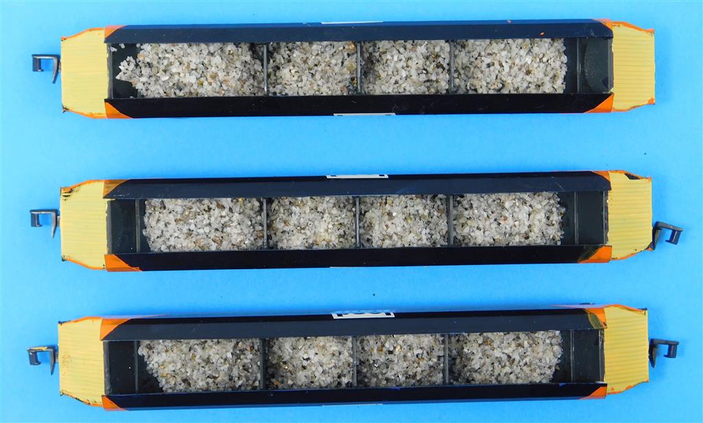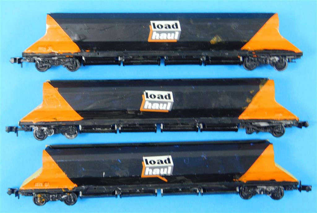 3 N gauge kit built load haul hopper wagons, missing one wheel and one coupling, repaint candidates, in fair condition, no original box