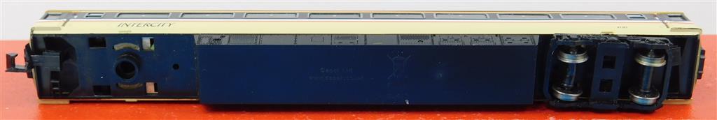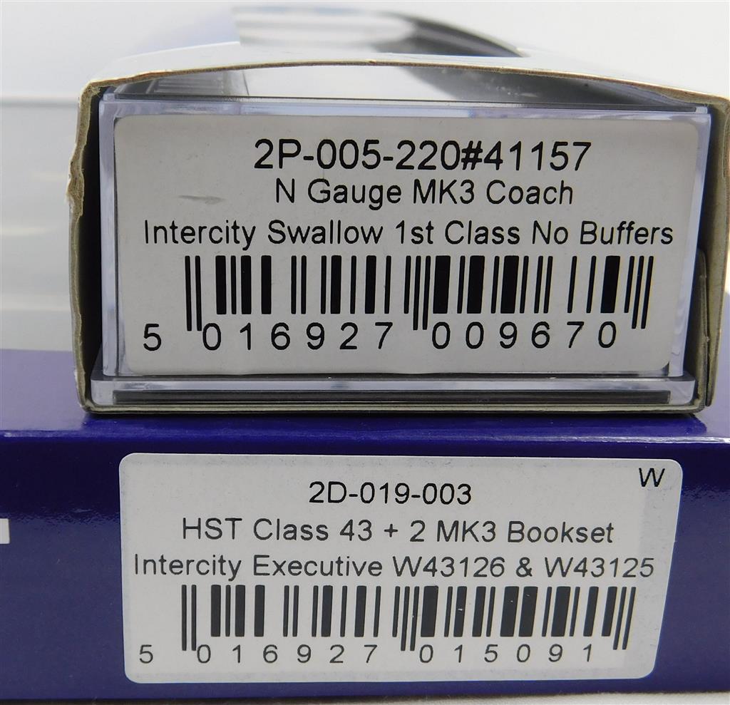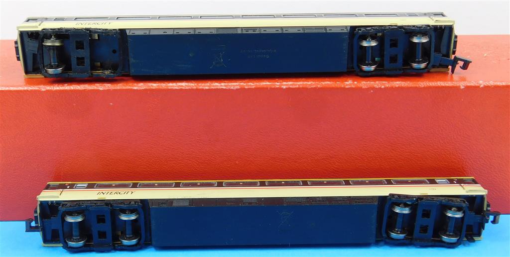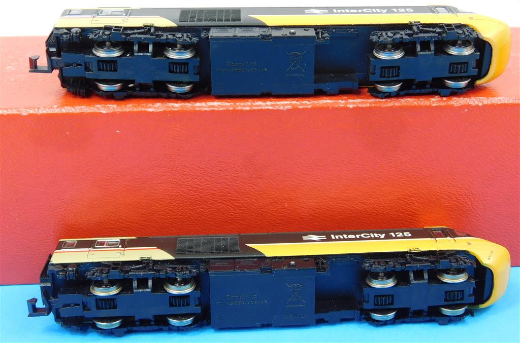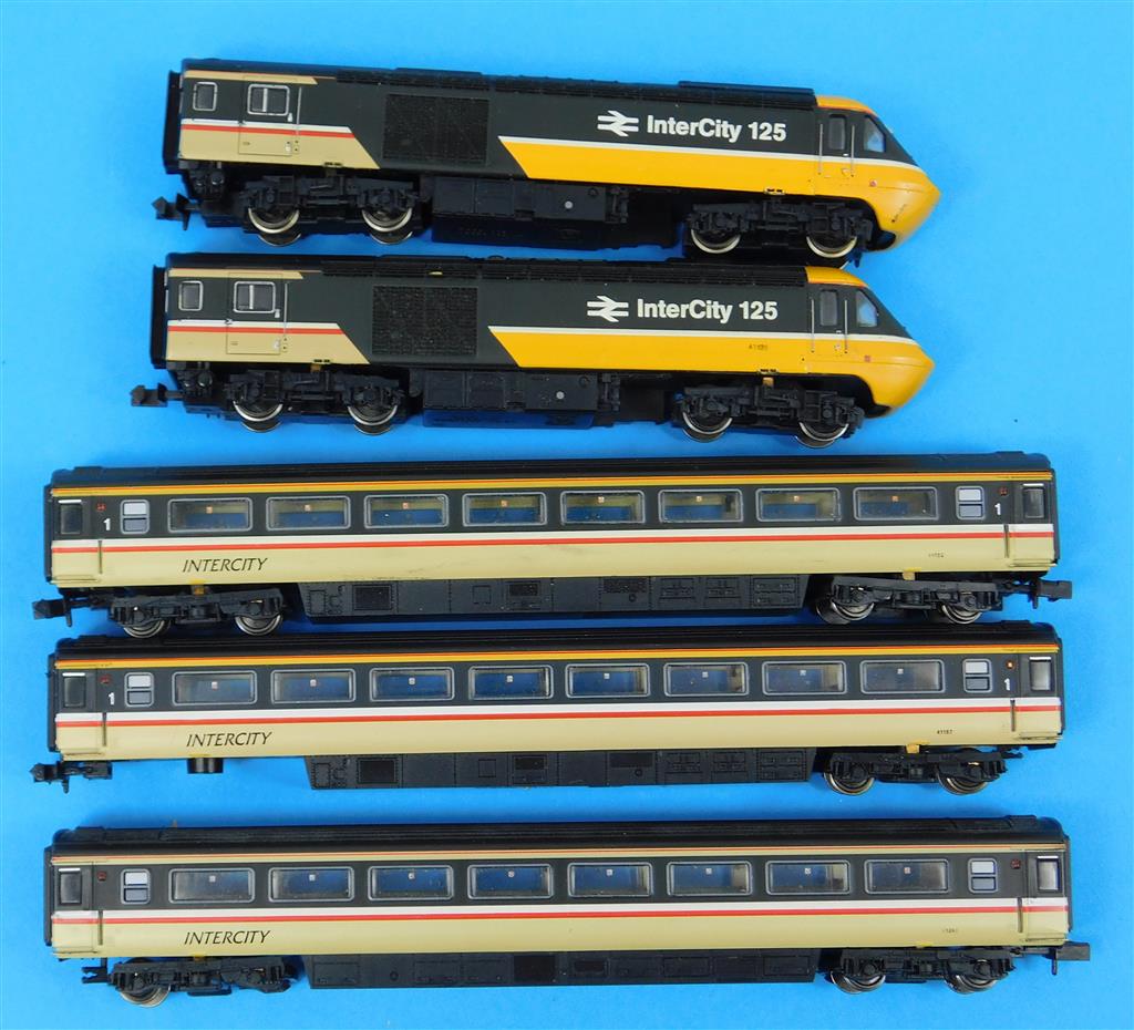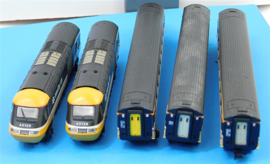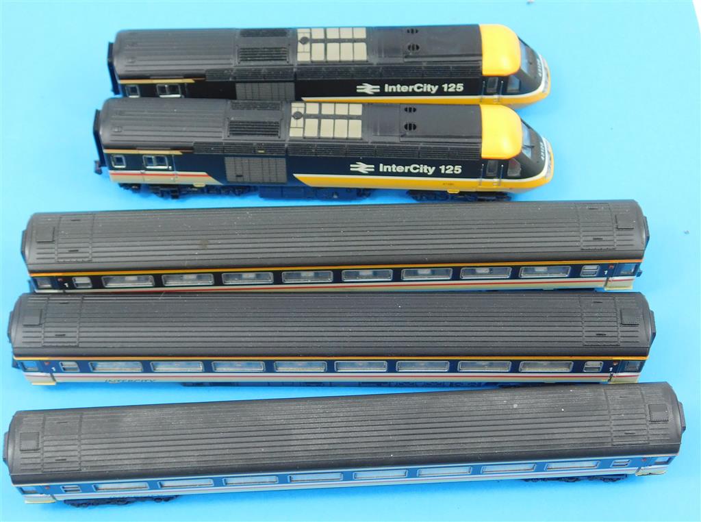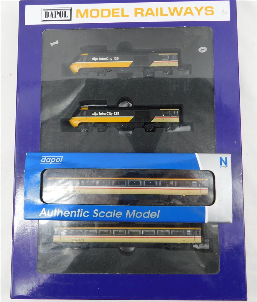 A Dapol N gauge InterCity HST, DCC fitted, power car is a good runner on DCC (#10) and DC, directional head and tail light, coaches need attention as they are missing bogies, wheels and have damaged couplings, supplied in the original box, sold as a project or a source of parts.