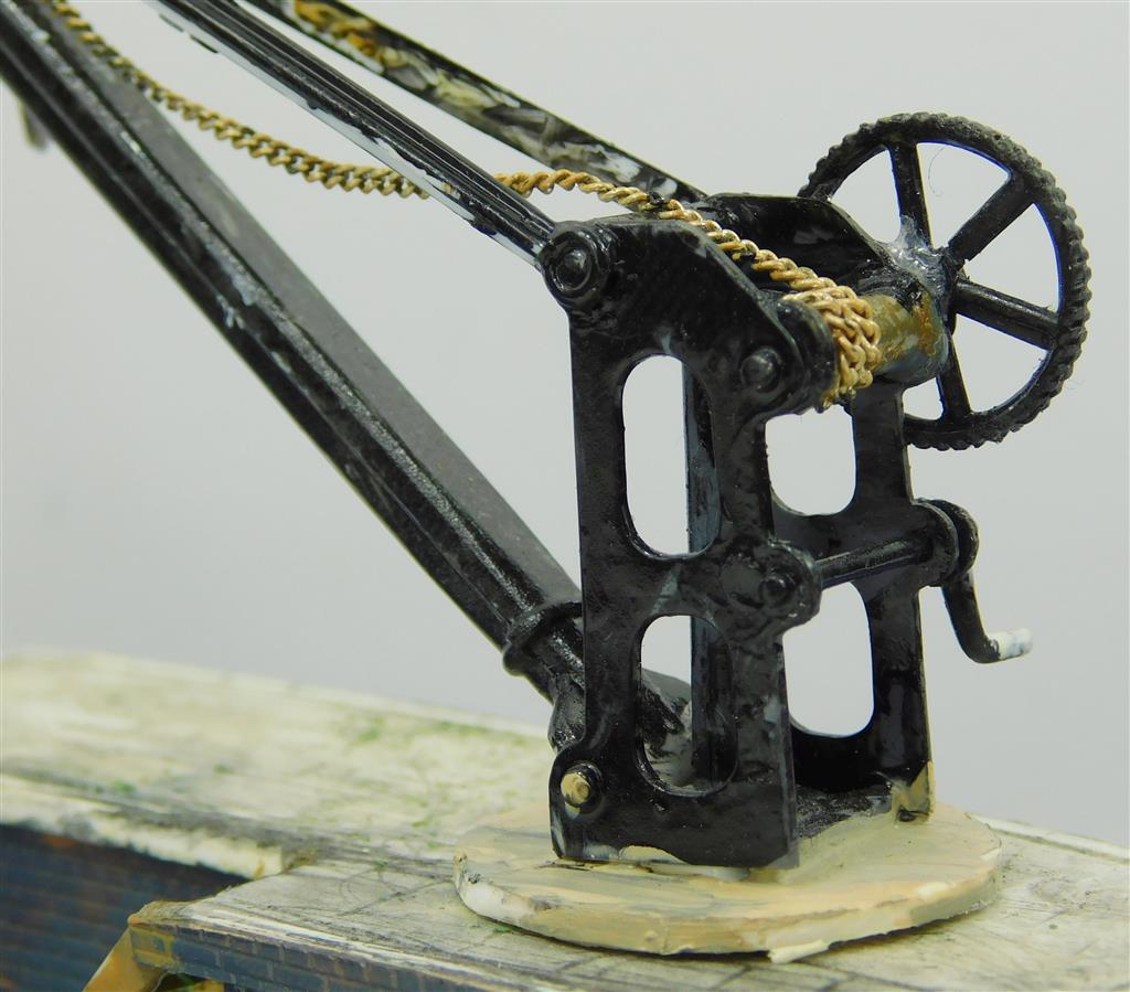 A painted white metal platform mounted crane, some fettling required, as removed from a layout