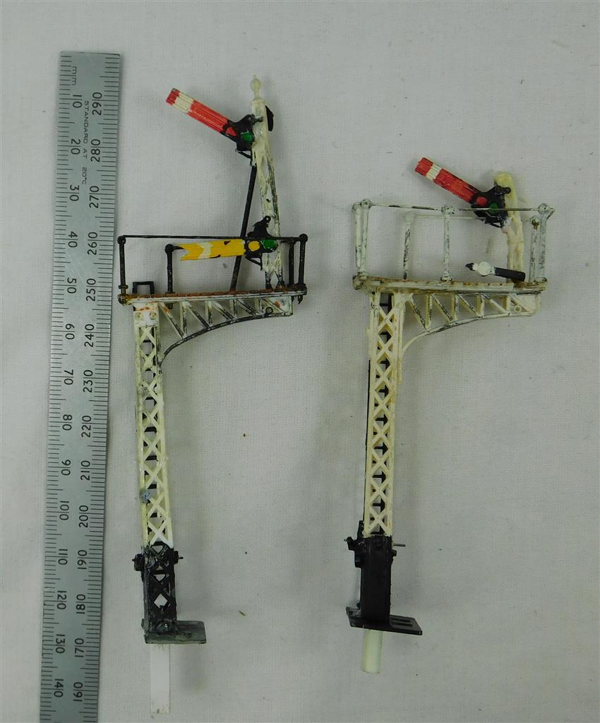 A pair of assembled non-operating Ratio 00 gauge lattice post signals, some fettling required, as removed from a layout