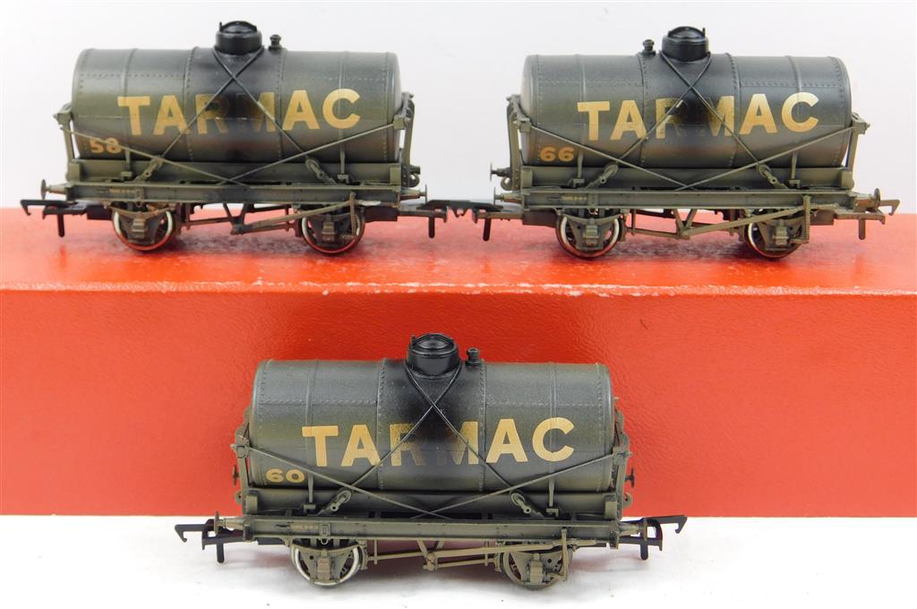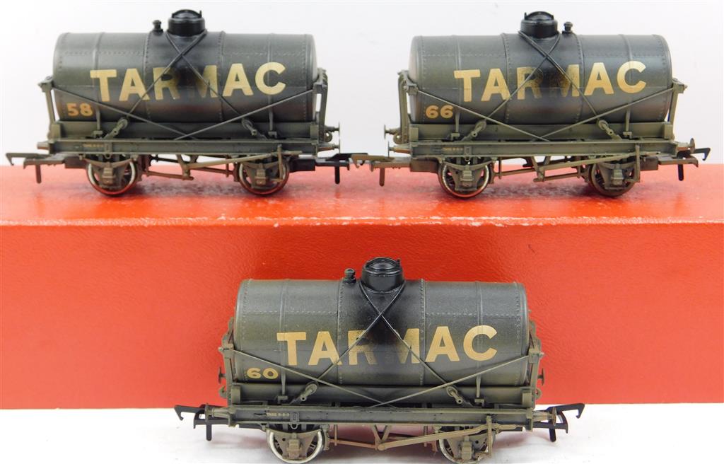 3 Bachmann Tarmac 14 ton tank wagons number 58, 60 and 66, missing one buffer otherwise in good condition, no original boxes