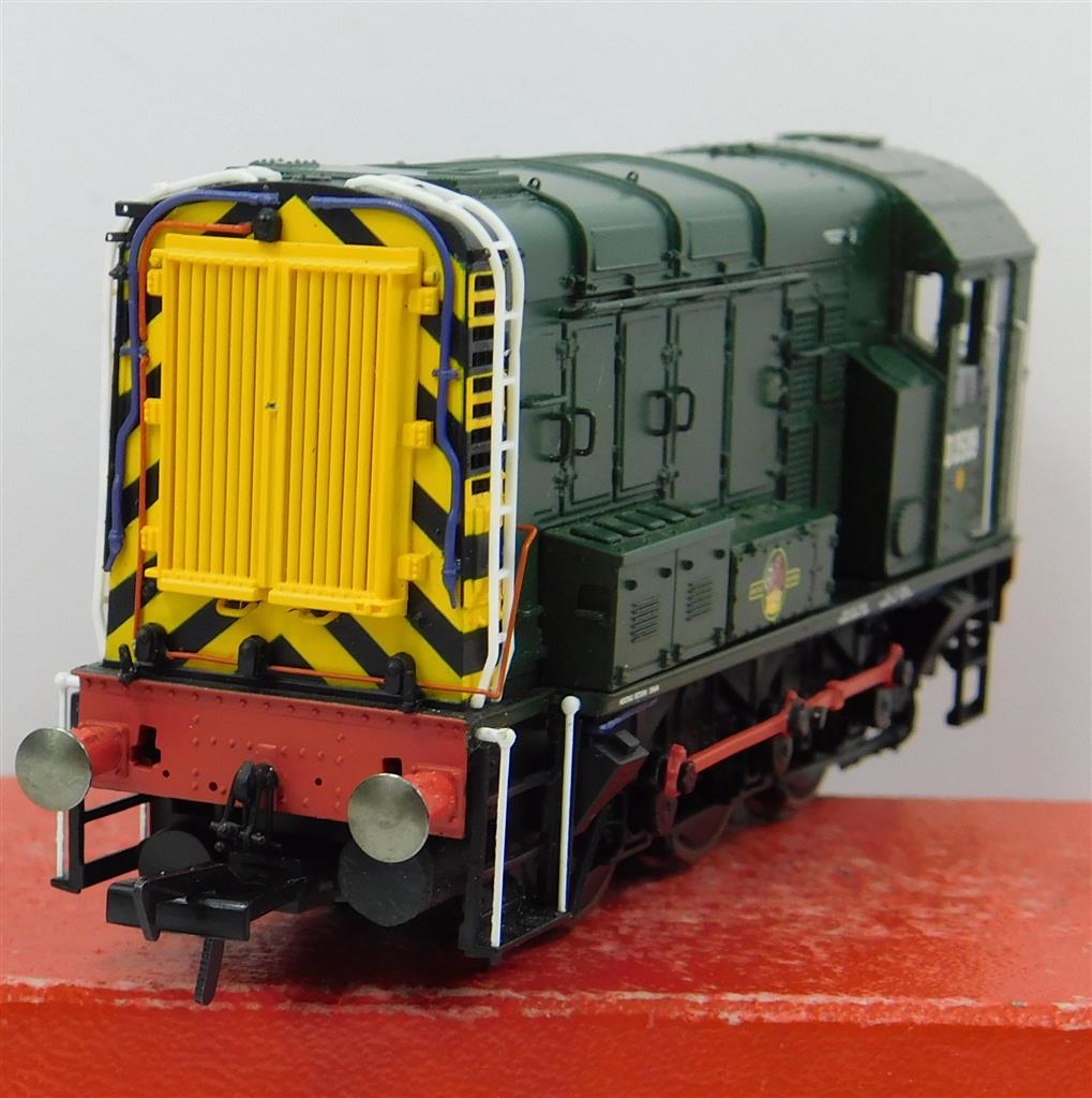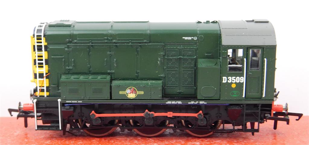 A Hornby class 08 number D3509, DCC fitted (Hornby chip,#'3), runs on both DC and DCC with a rhythmic clatter, mechanics needs investigating and fixing, in good cosmetic condition, supplied in the original box