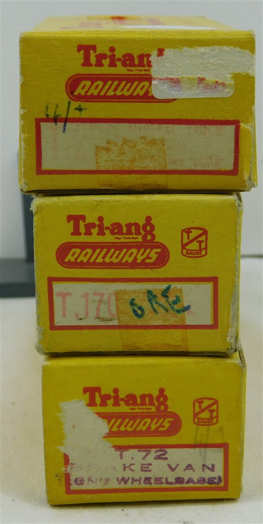 3 Tri-ang TT bulk ore wagons plus brake van, will need a clean, condition varies, two supplied with original boxes