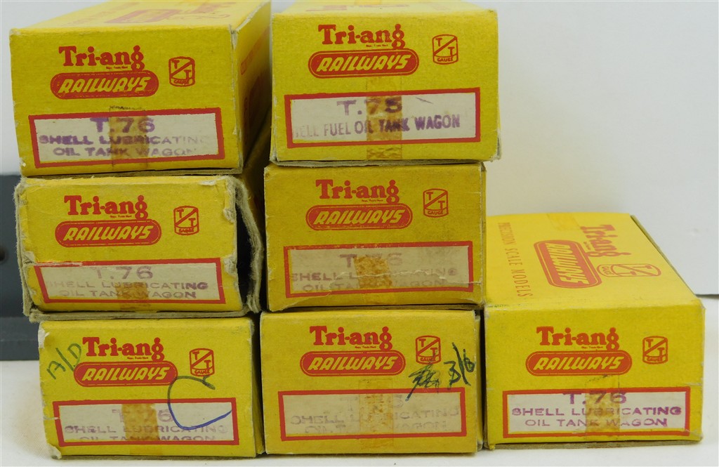 8 Tri-ang TT Shell Lubricating Oil Tank Wagons will need a clean, condition varies, seven supplied in original boxes