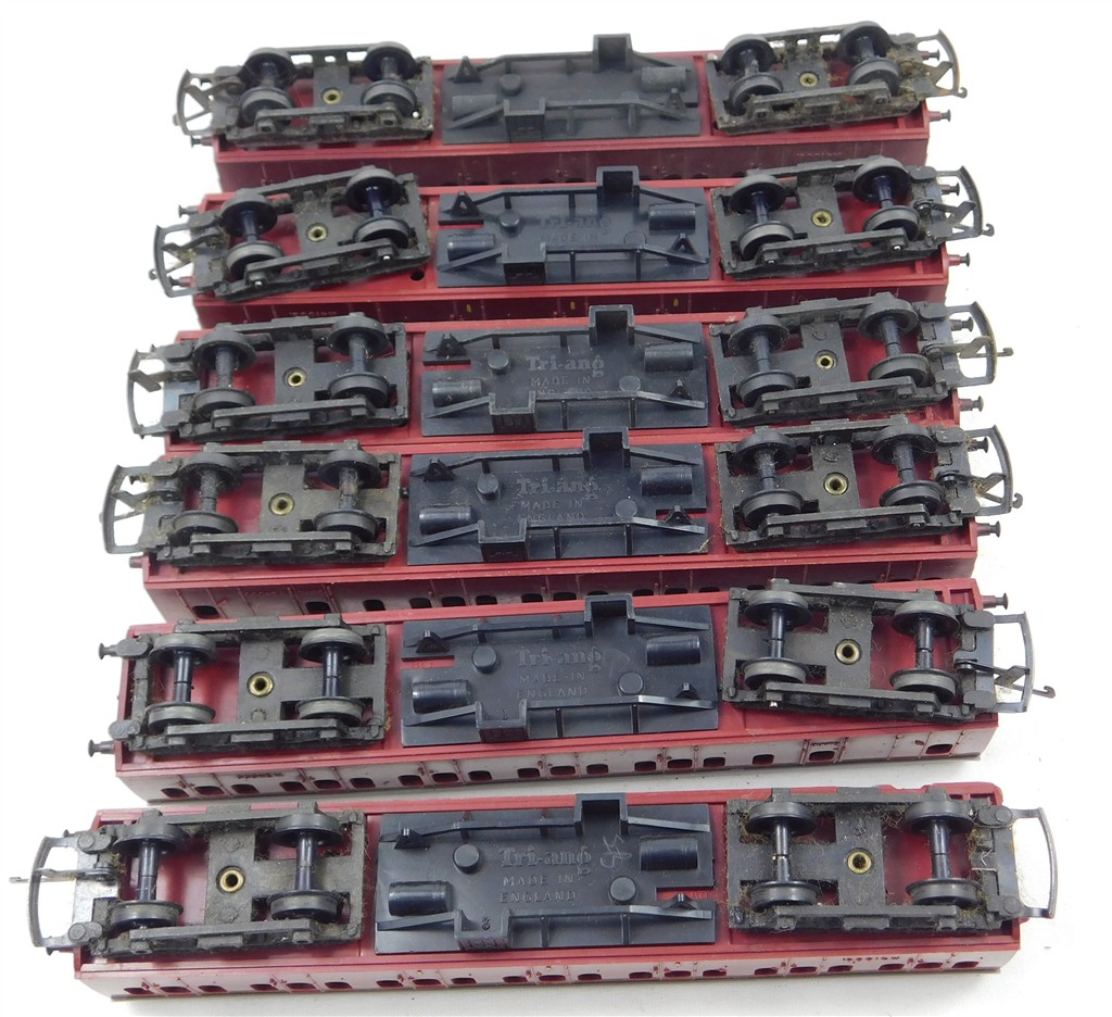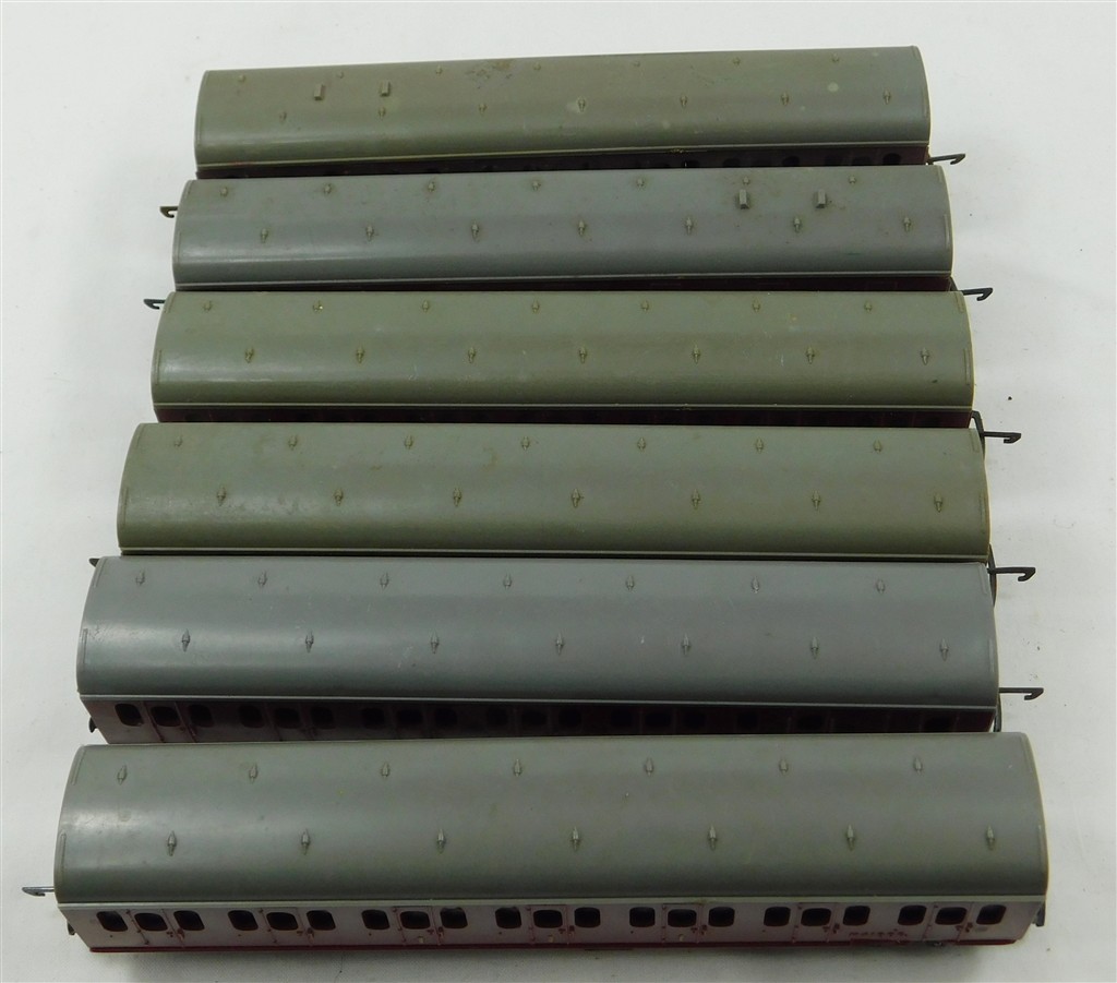 6 Tri-ang TT maroon Suburban coaches for spares,repair, repainting or remodelling, all in used condition, no original boxes.