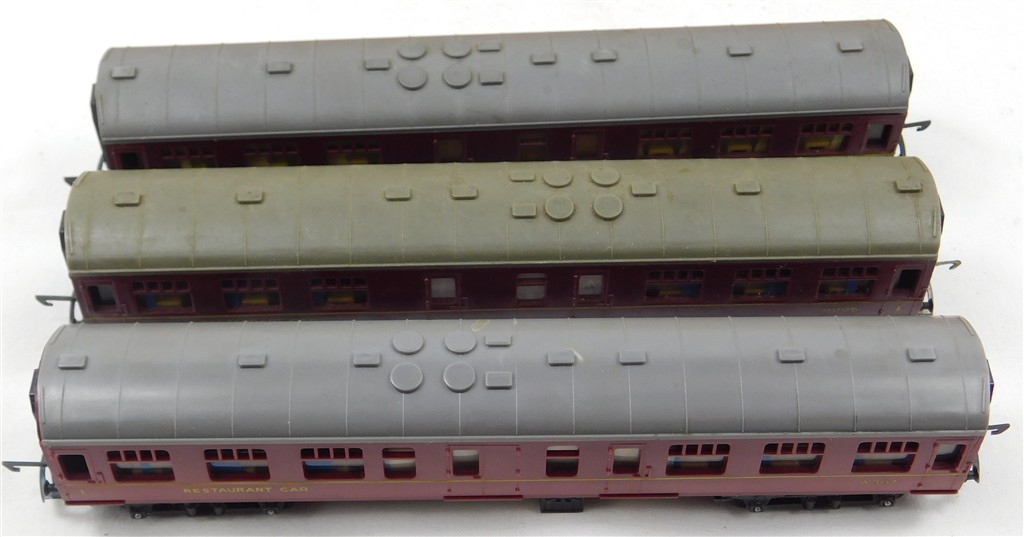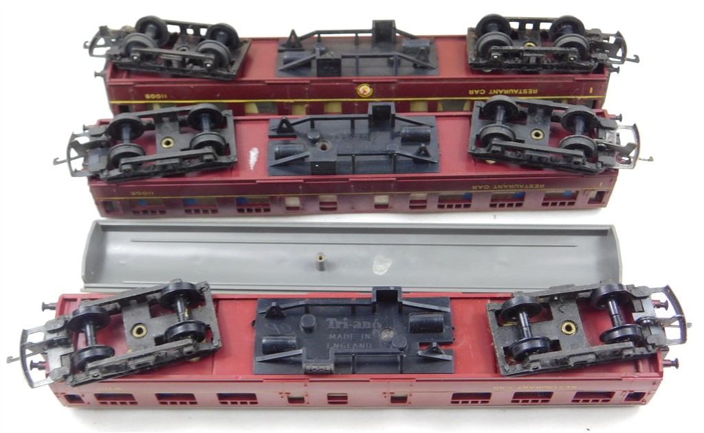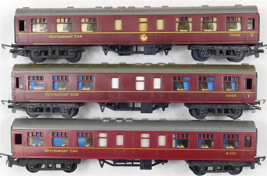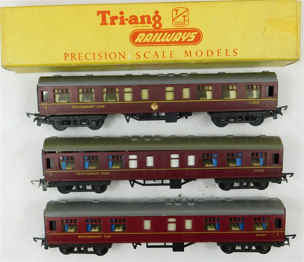3 Tri-ang TT maroon Restaurant cars, all in good used condition, some marks to the roofs as shown