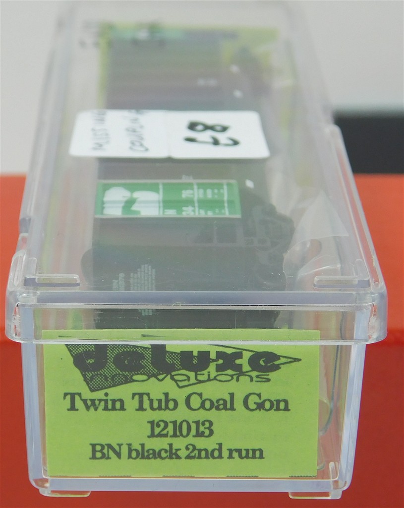 A Deluxe twin tub coal gondola in Burlington livery, missing one coupling, in good condition, supplied in the original box,