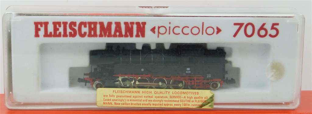 A Fleischmann 7065 N gauge German DB class 65 loco, shorted on test, not investigated further, missing one buffer and one distorted buffer, in good cosmetic condition, supplied in the original box