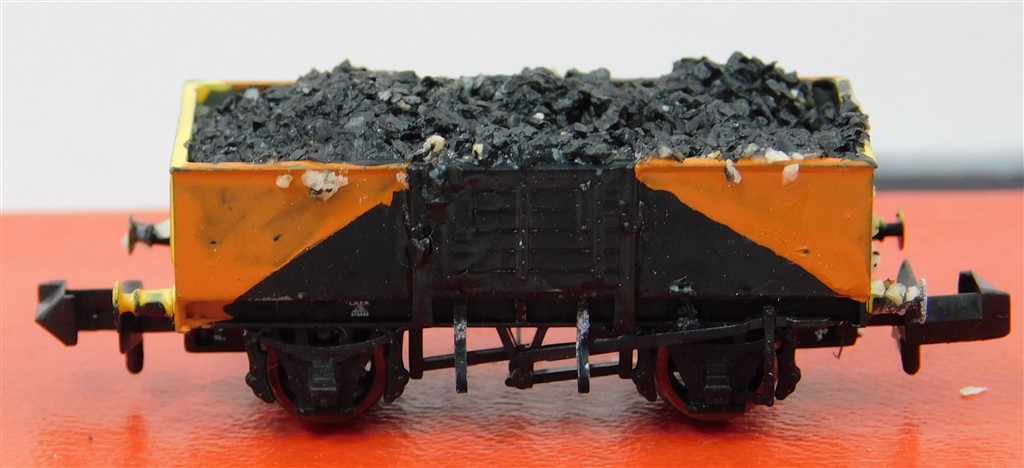 British N gauge: Repainted Graham Farish N gauge black and orange open wagon
