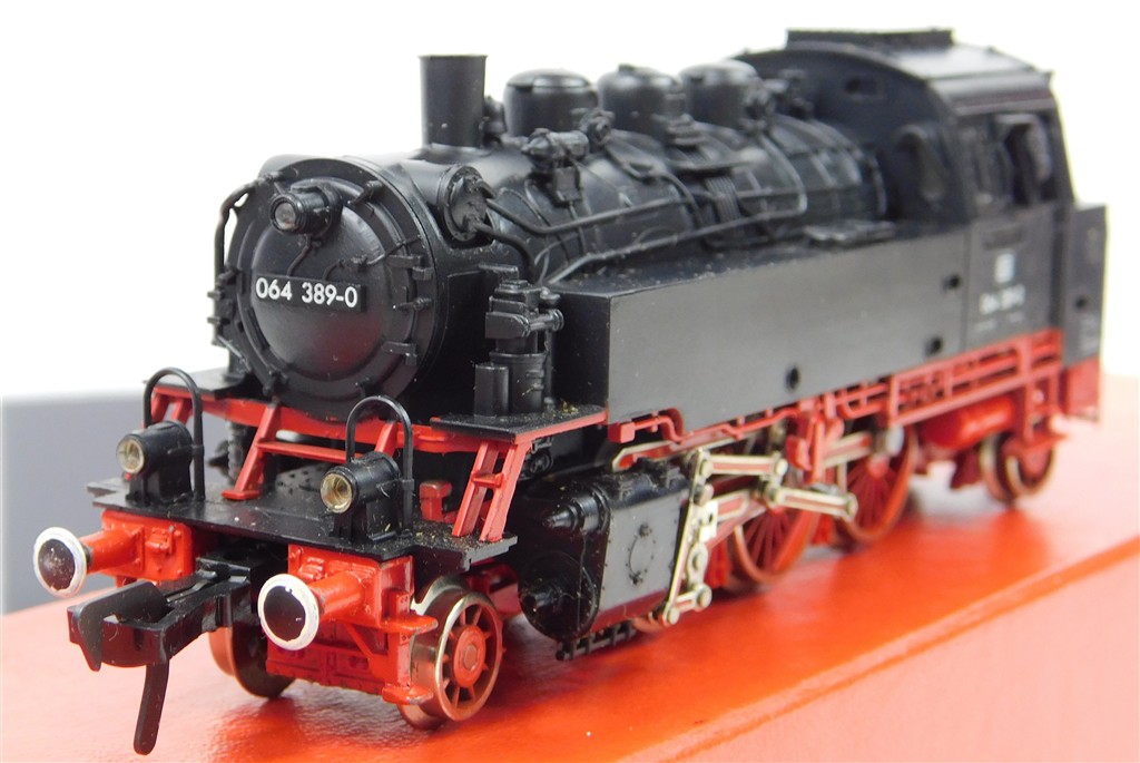 A Fleischmann 4064 German DB class 64 steam loco, Lenz DCC fitted (hardwired, #6489), good runner on both DC and DCC with working bunker lights only, in good condition, fitted with pivoted Fleischmann Profi couplings, supplied in the original box. Note this is a 1:80 scale model.