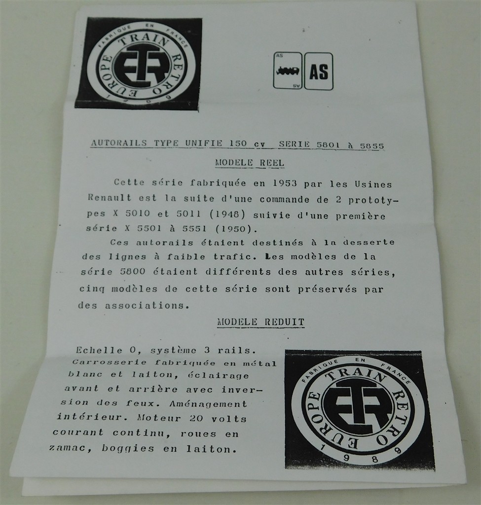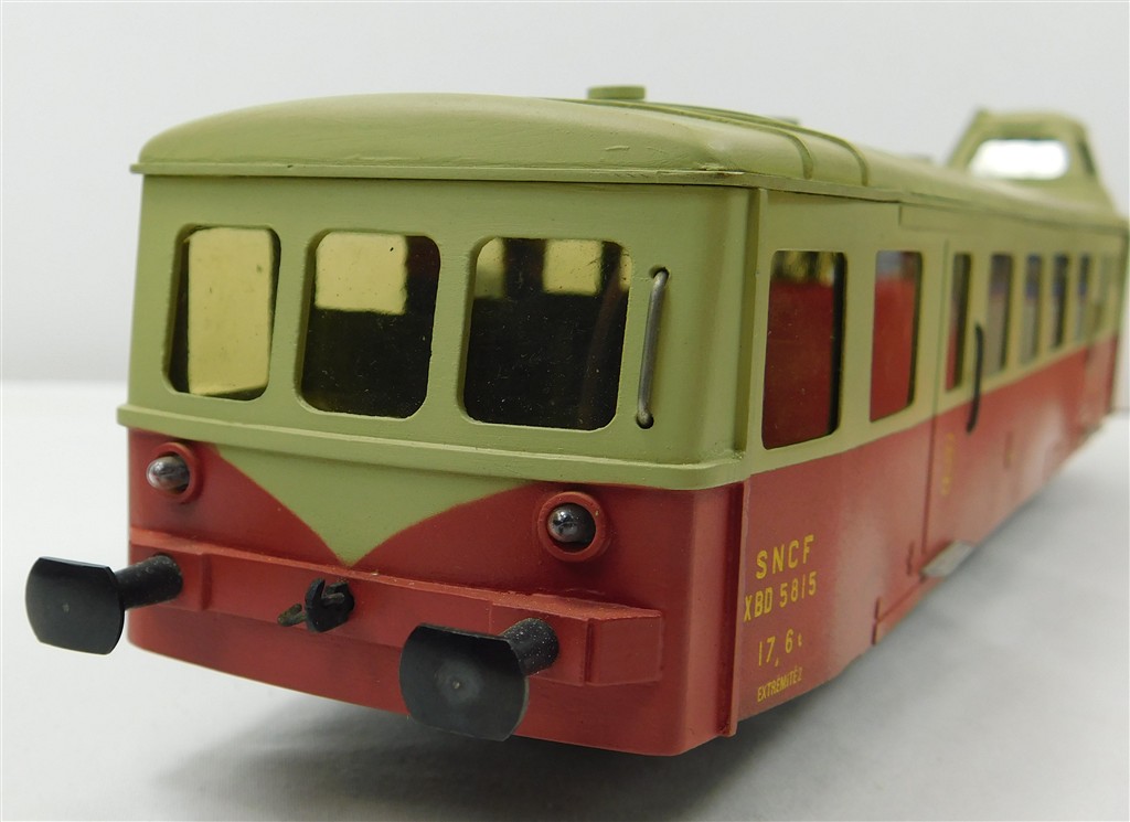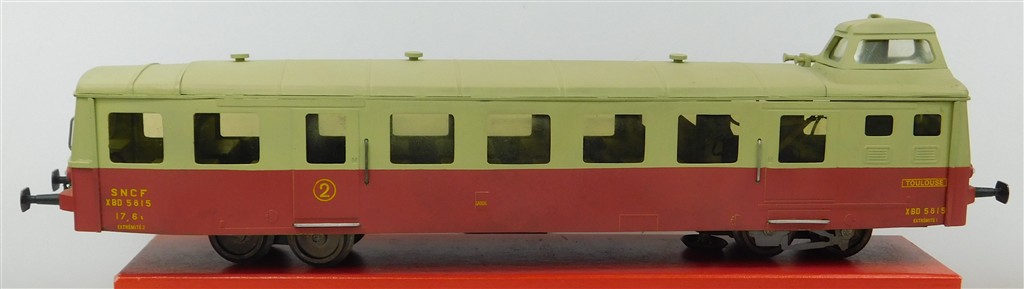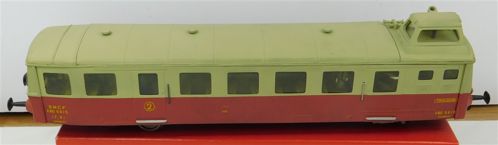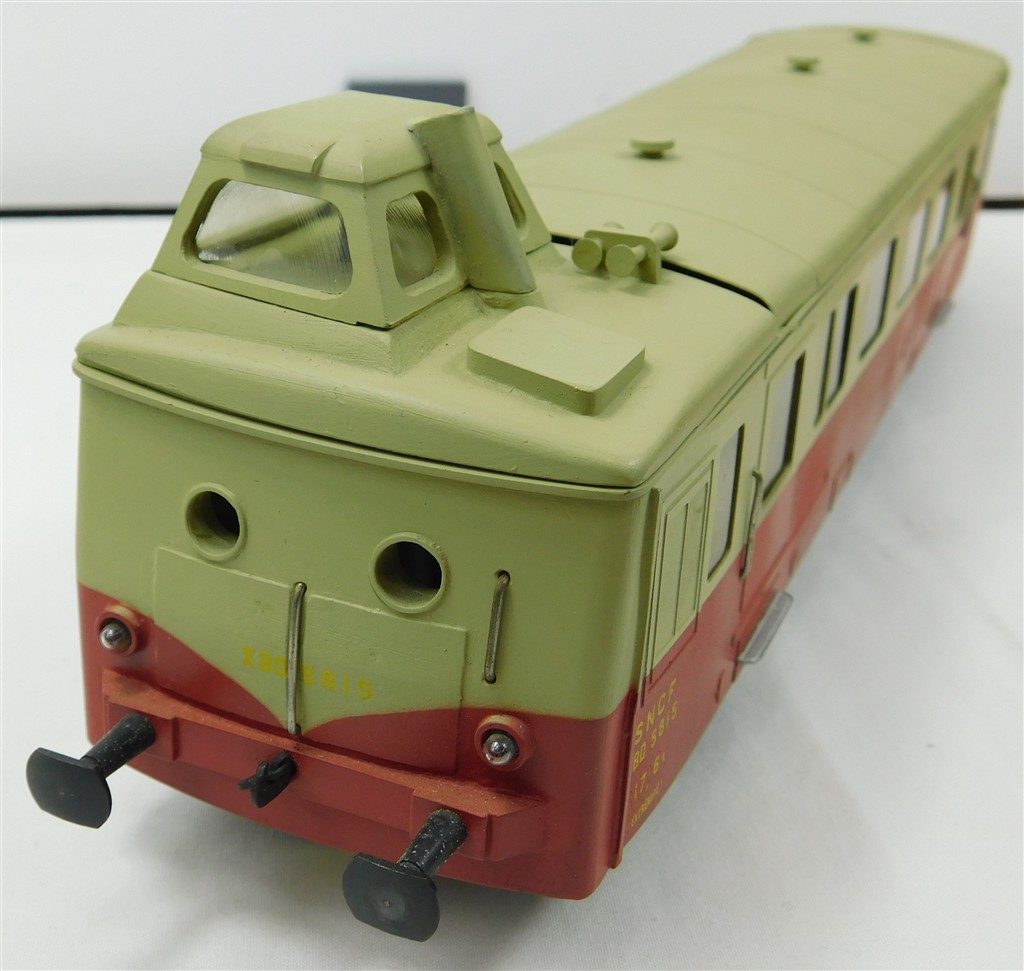 An AS 0 gauge 3 rail French SNCF Picasso railcar XBD 5815 of Toulouse, made in France circa 1989, in very good condition, a good runner but the pickups need to be kept clean for it to run well, supplied in the original wooden box with a rather terse information sheet. A substantial heavy model, mainly metal construction, weighs 2.5kg!