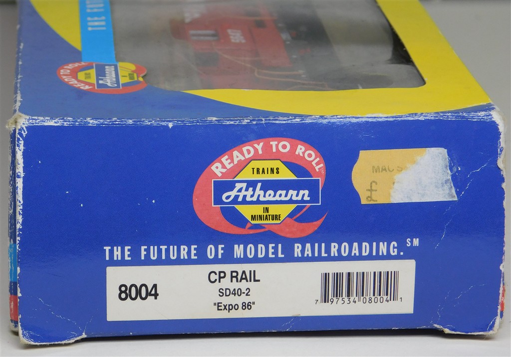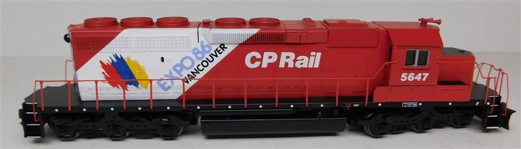 An Athearn 8004 CPRail SD40-2 diesel loco 5647 Expo 86 Vancouver, good runner with a scraping noise in one direction, cause needs investigating and fixing, handrails need careful refitting otherwise in good condition, supplied in the original box, Kadee type couplings