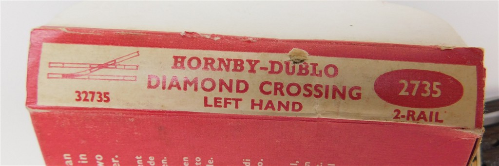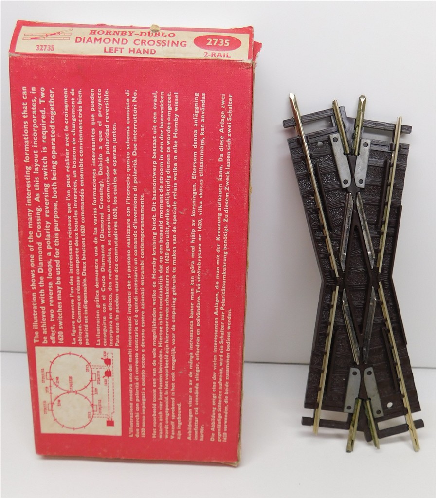 A Hornby Dublo 2735 2 rail left hand diamond crossing, in good used condition, supplied in the tatty original box