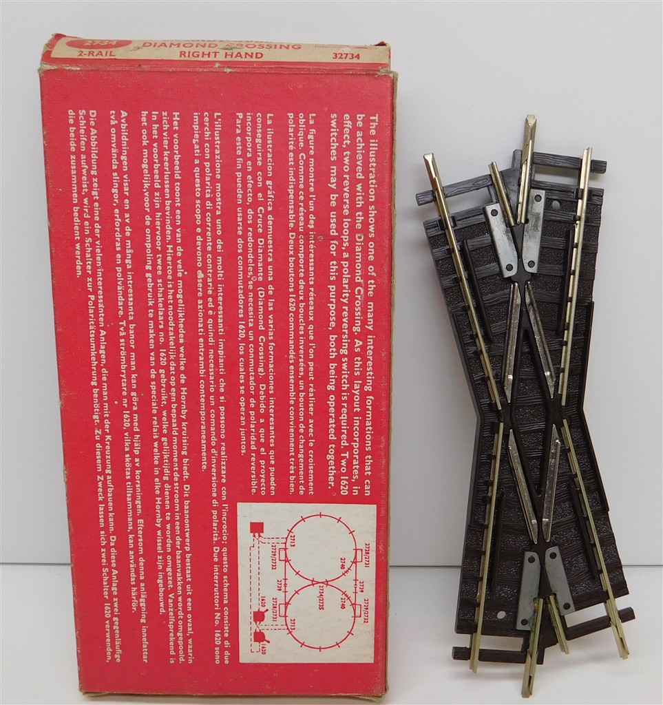 A Hornby Dublo 2734 2 rail right hand diamond crossing, in good used condition, supplied in the tatty original box