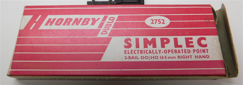 A Hornby Dublo 2752 Right Hand Simplec Electric Point, missing one screw and the mechanism is stiff and needs a thorough electrical clean otherwise in good used condition, supplied in the original box with instructions