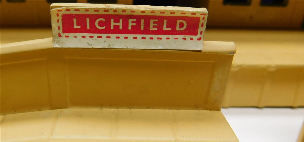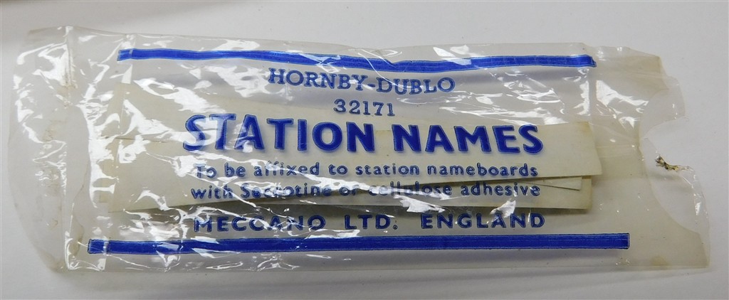 A Hornby Dublo D1 metal through station set, in fair condition, supplied in the original box with alternate names