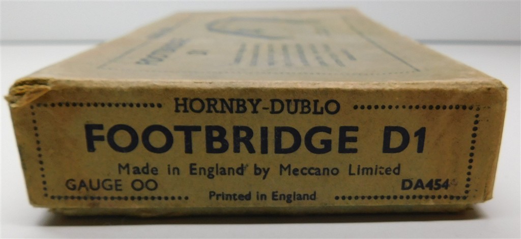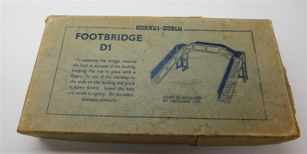 A Hornby Dublo D1 metal footbridge with added Unseen stair carpet holder adverts, in good condition, supplied in the original box