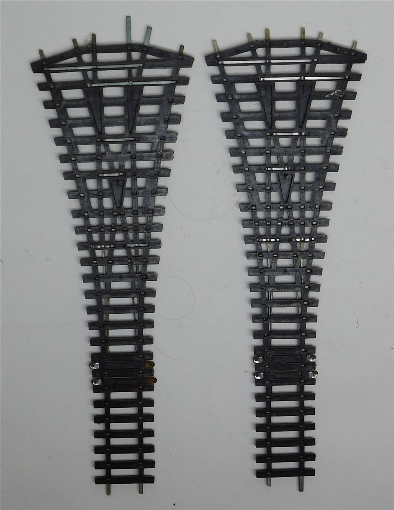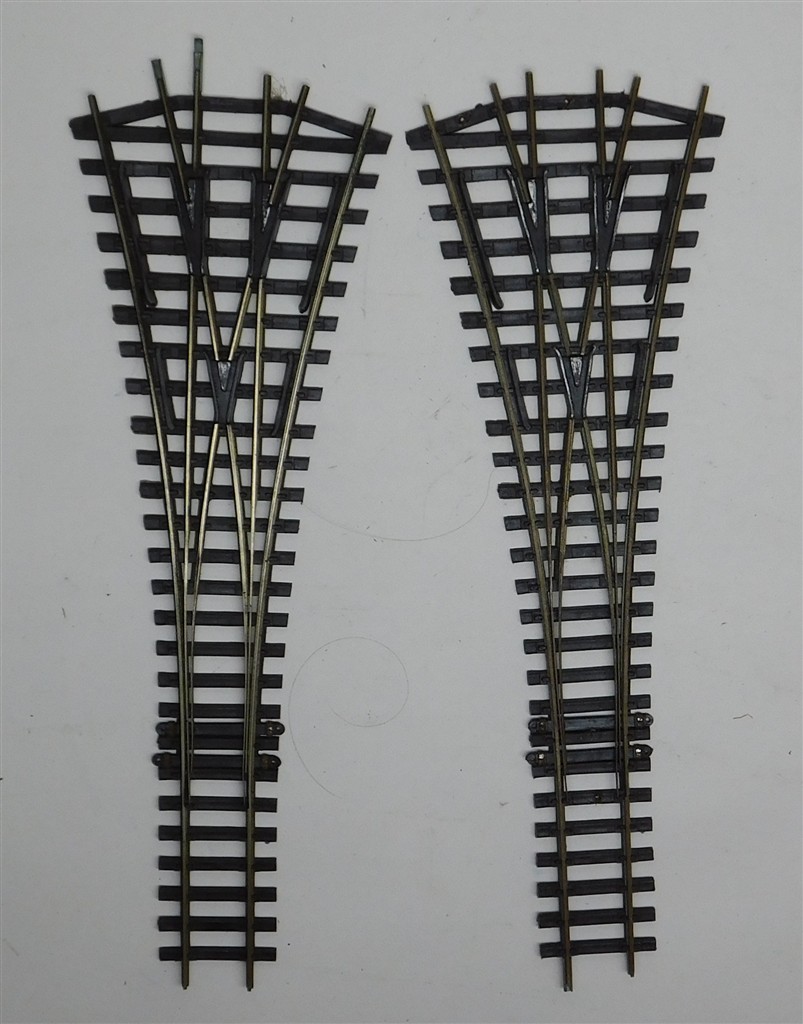 2 Graham Farish Formoway large radius 3 way insulfrog points, 1960s production, points are not self-latching, note that the rail height in 2.75mm rather than the 2.5mm (Code 100) of Peco or Hornby, as removed from a layout
