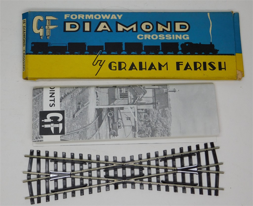 A Graham Farish Formoway 15° diamond crossing, 1960s production, note that the rail height in 2.75mm rather than the 2.5mm (Code 100) of Peco or Hornby, in good condition, supplied in the original box