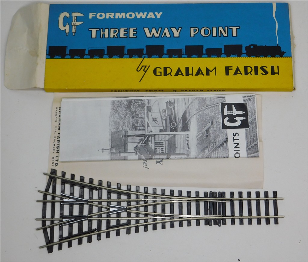A Graham Farish Formoway 3 way point, insulfrog, 1960s production, note that the rail height in 2.75mm rather than the 2.5mm (Code 100) of Peco or Hornby, in good condition, supplied in the original box