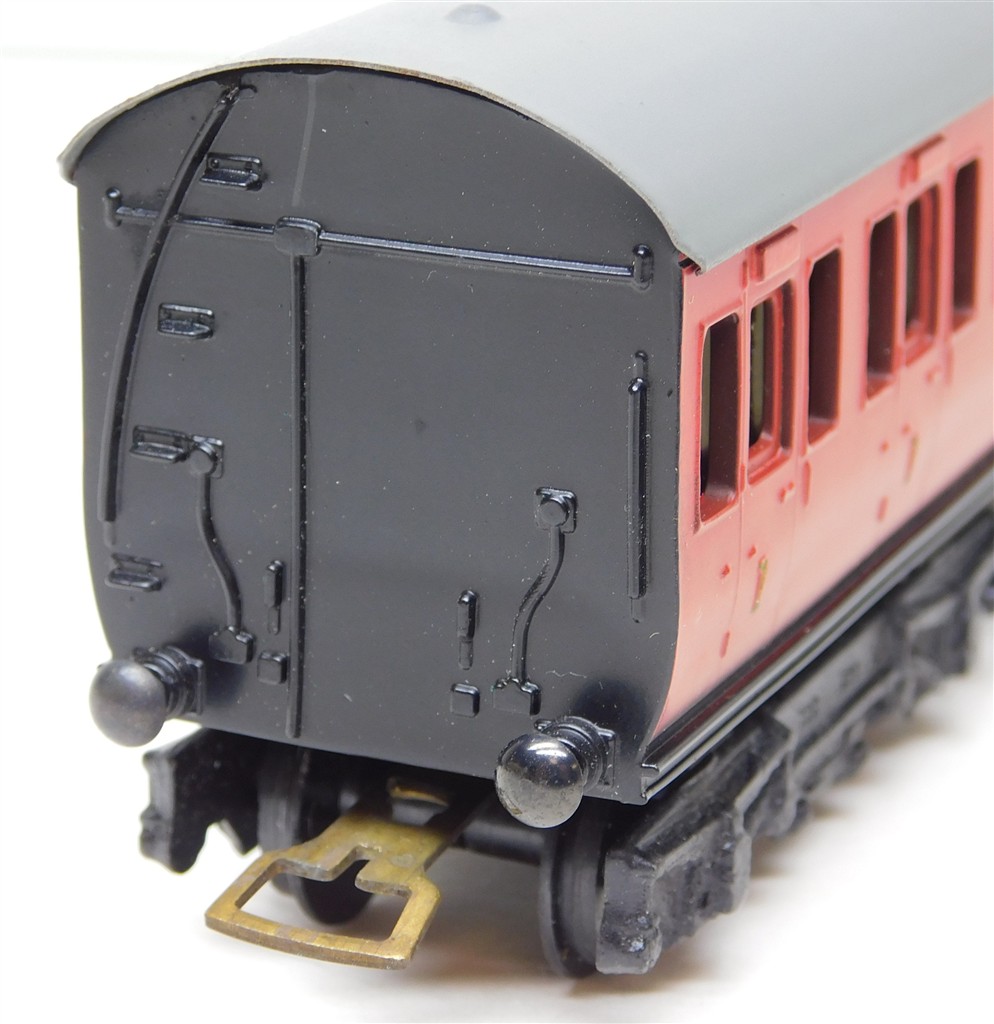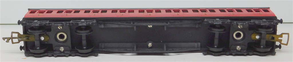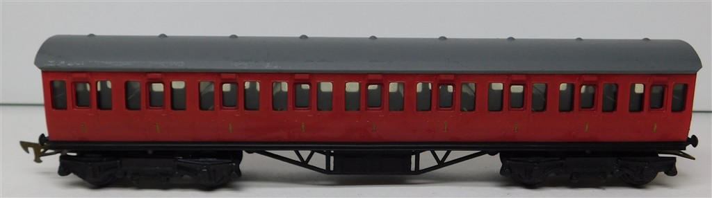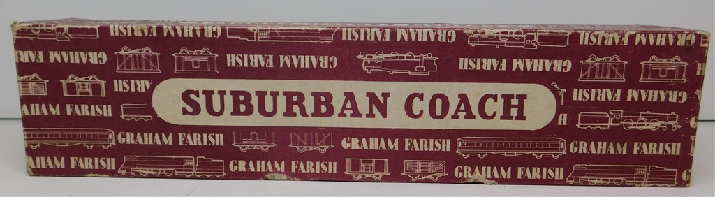 A Graham Farish BR Composite Suburban coach, red, 1950s production, heavy, missing one coupling hook otherwise in good used condition, supplied in an incorrect original box