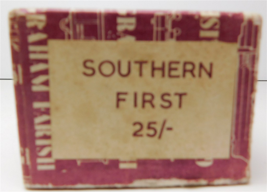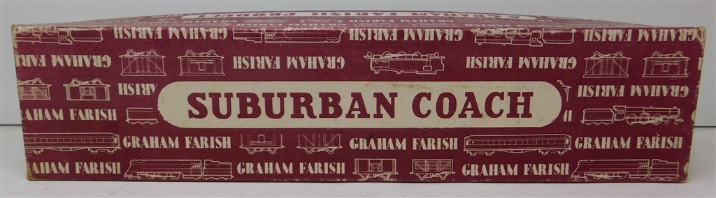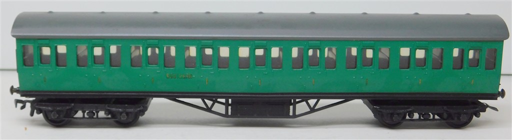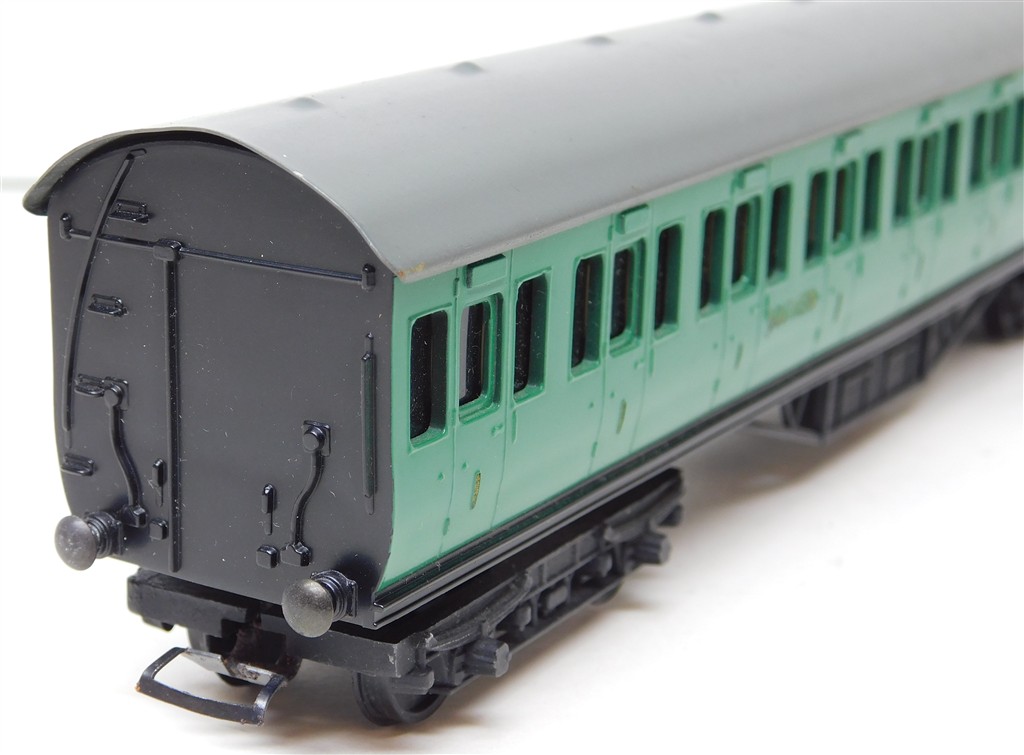 A Graham Farish Southern Railway First Class Suburban coach, green, 1950s production, heavy, coupling changed for a Peco coupling one end, in good used condition, supplied in the original box