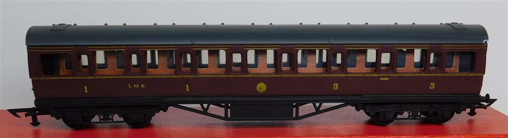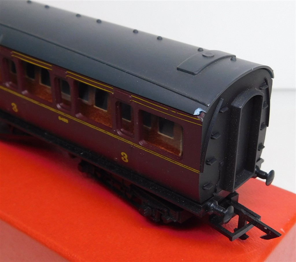 00 Coaches: Graham Farish LMS mainline coach number 9485, chip to corner of roof (C)
