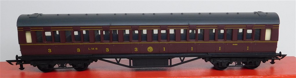 A Graham Farish LMS mainline coach number 9485, chip to corner of roof and one broken buffer otherwise in good condition, supplied in an original box (C)