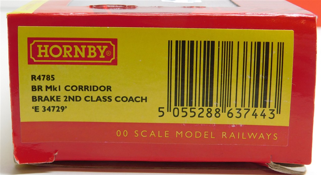 A Hornby R4785 BR Mk1 brake 2nd class corridor coach, crudely renumbered otherwise in good condition, bogie mounted couplings, supplied in the original box