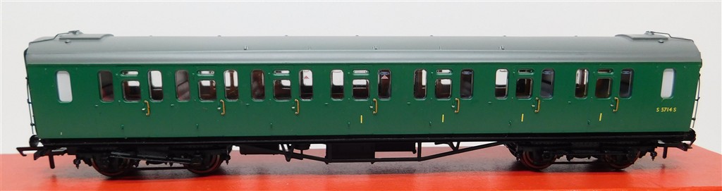 A Hornby R4886 BR Bullied Suburban Composite coach S5714S, extensive glue spots/blistered paint, in fair condition, supplied in the original box, please study the photographs carefully