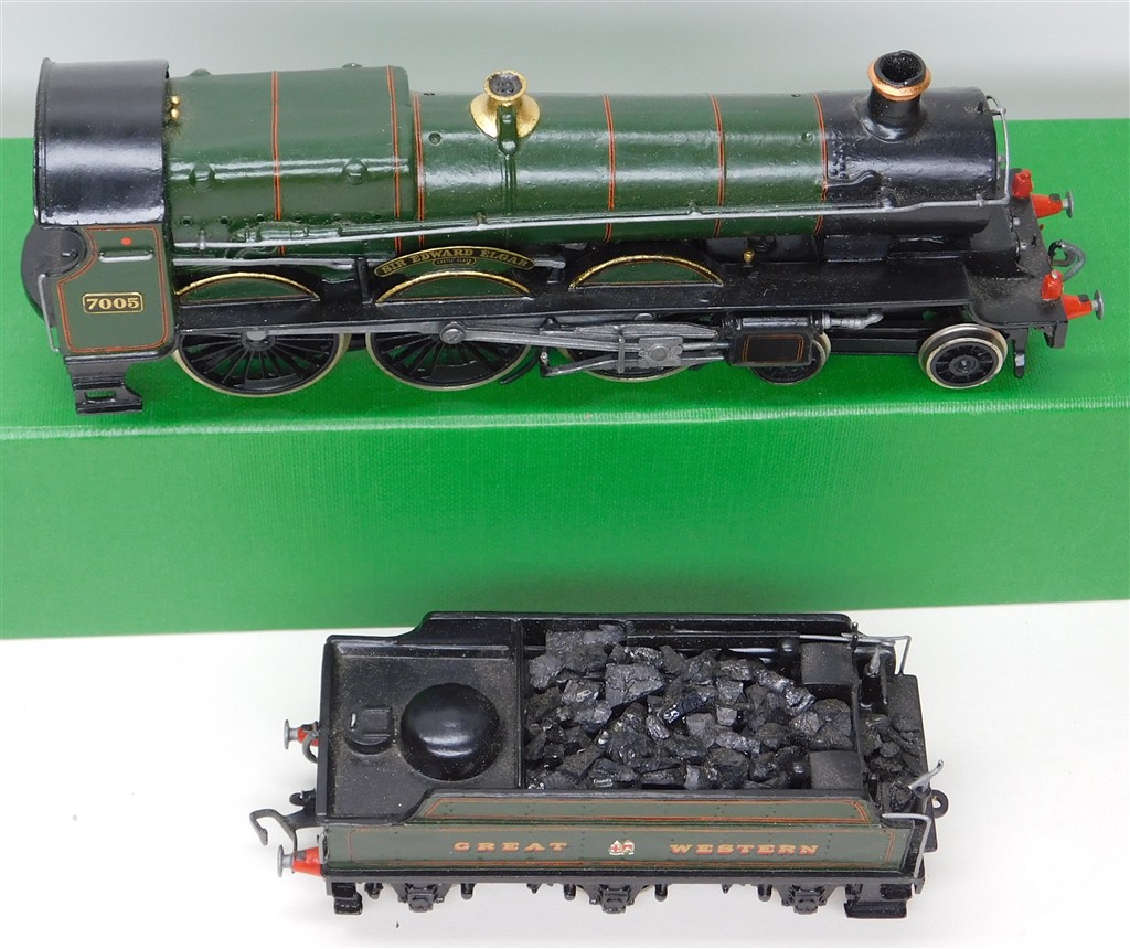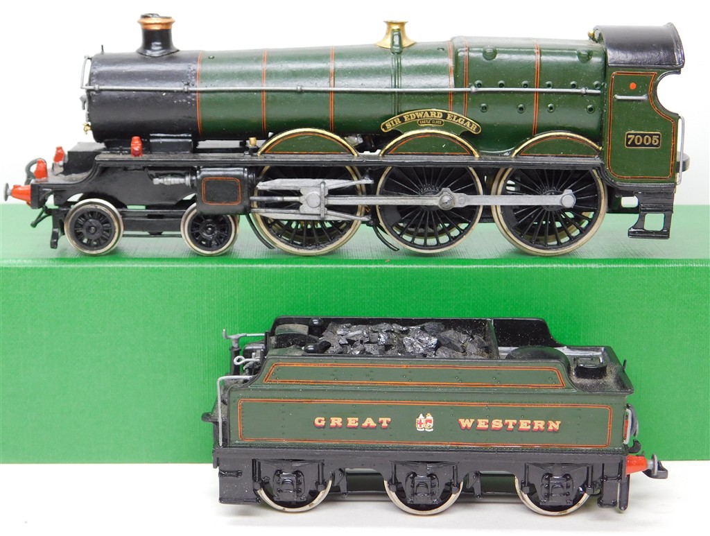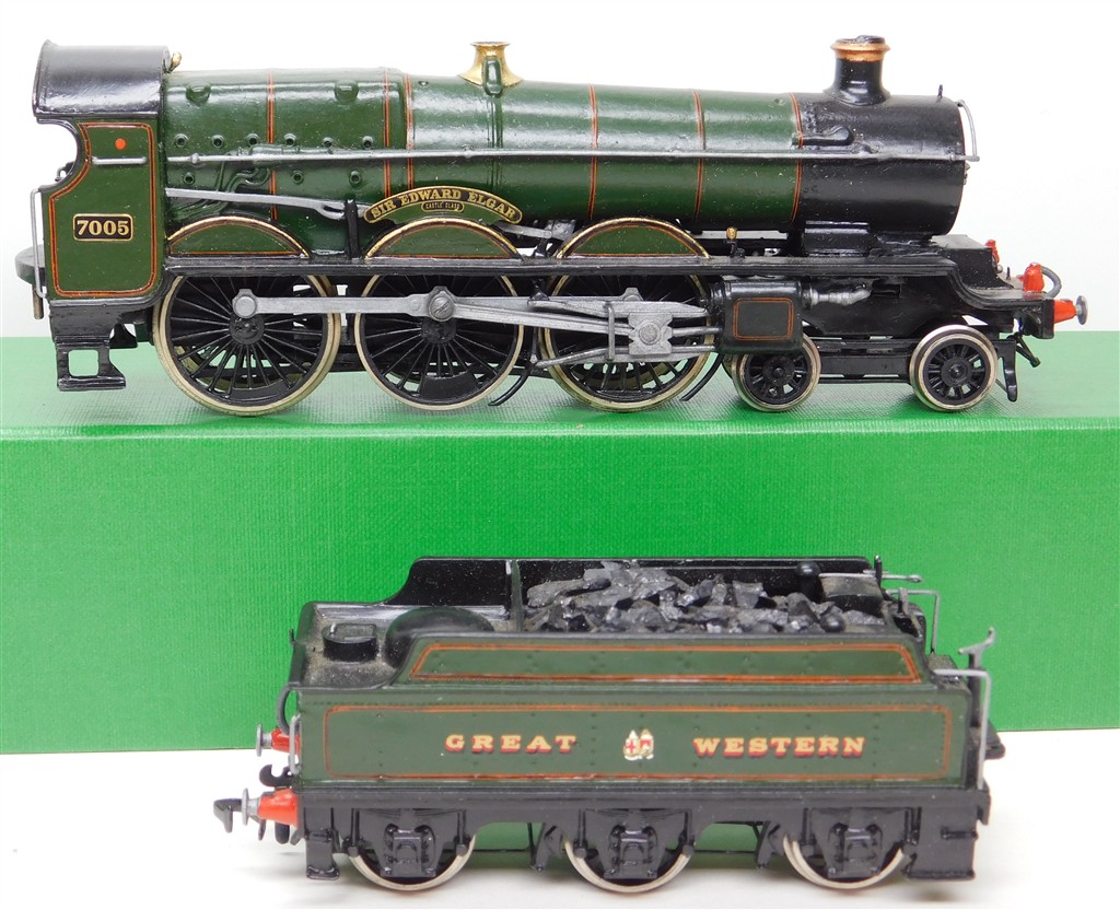 A Wills kitbuilt GWR Star 4-6-0 steam loco incorrectly numbered 7005 Sir Edward Elgar with Romford wheels, reluctant runner that needs a thorough electrical clean and lubrication, nicely assembled and painted, brass main drive gear, needs new name and numberplates, supplied in the original box. Why a Saint has been given a Castle's name is a bit of an enigma...