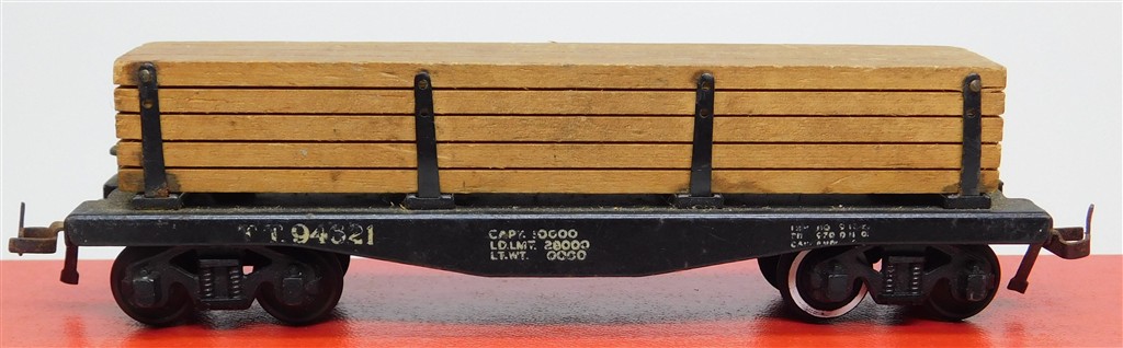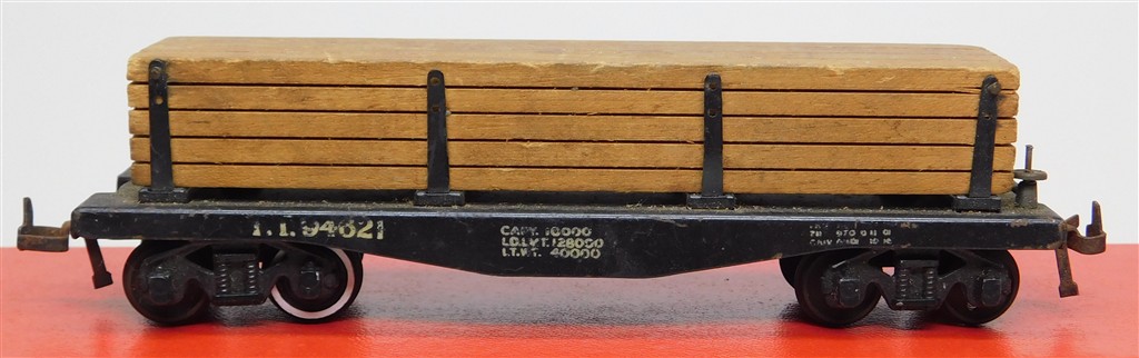 A 1950s Trix Twin Vintage American style lumber wagon with an assortment of changed wheels, in fair condition, no original box.