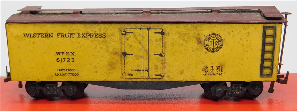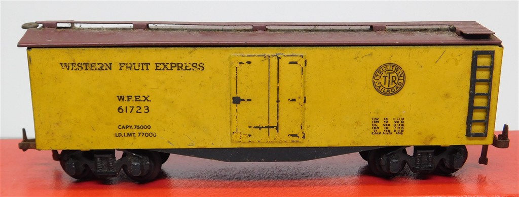 A 1950s Trix Twin Vintage American Western Fruit Express box car, in fair condition, original Trix deep flanged wheels fitted, no original box.