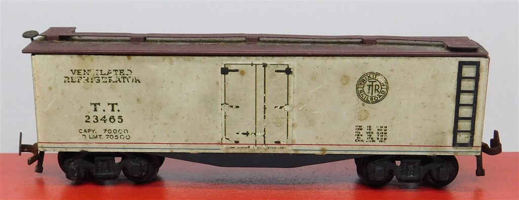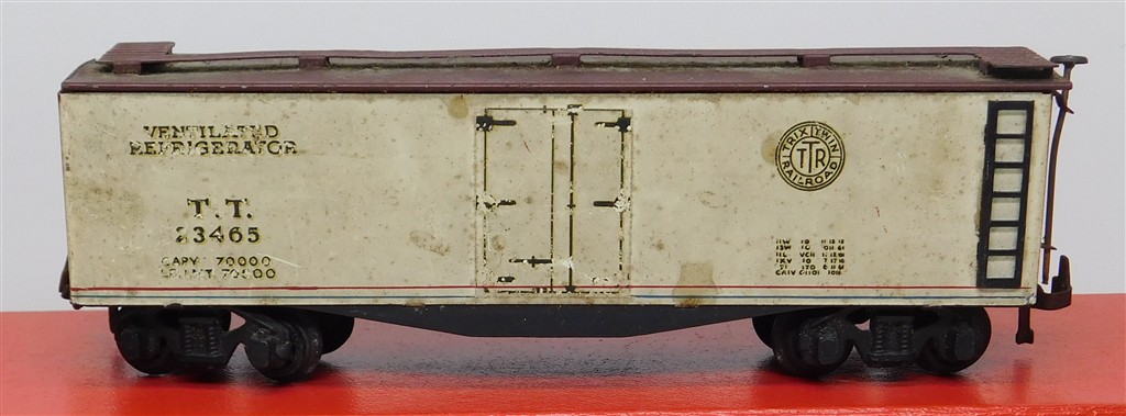 A 1950s Trix Twin Vintage American Ventilated Refrigerator car, in fair condition, original Trix deep flanged wheels fitted, no original box.