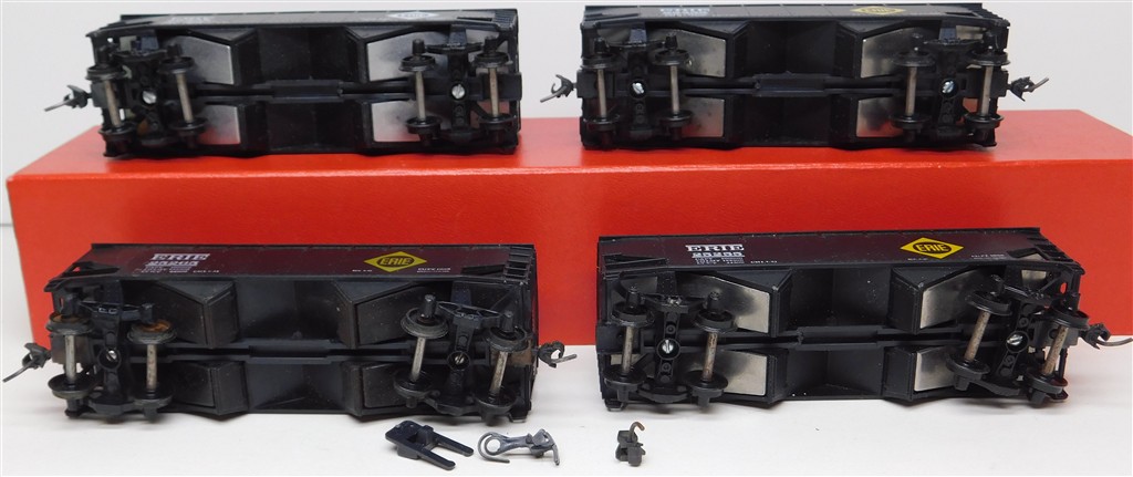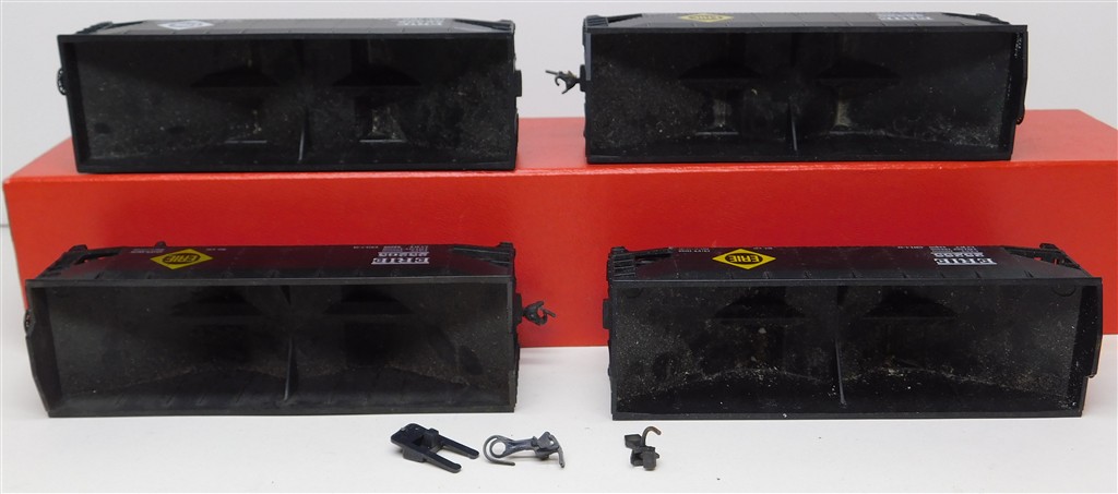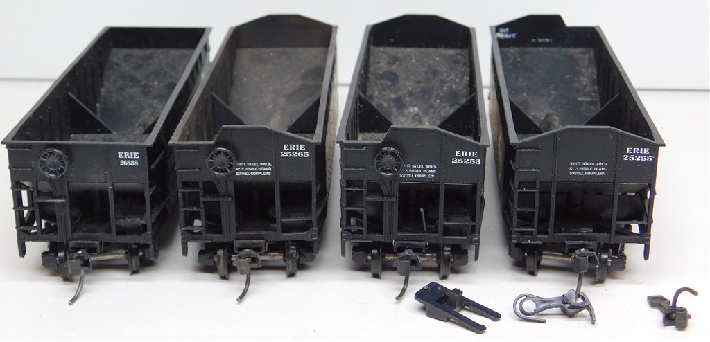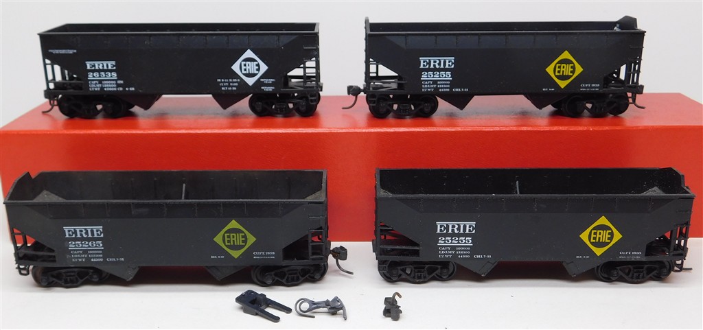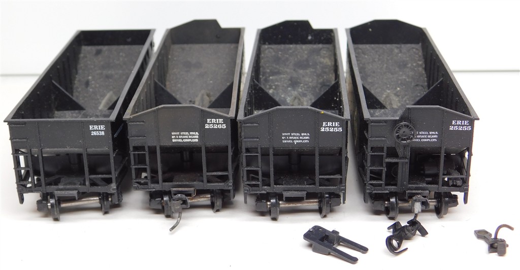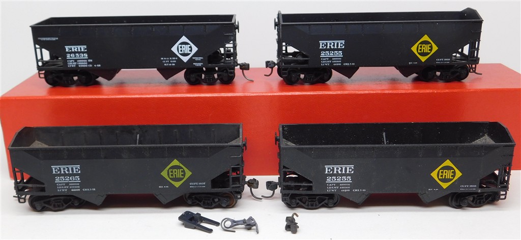 4 assorted Erie short hopper cars, various numbers, some couplings missing, needs a clean, in generally good condition, Kadee and horn-hook type couplings, no original boxes
