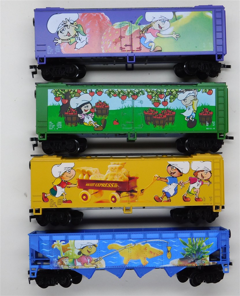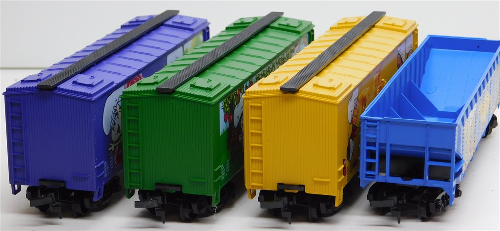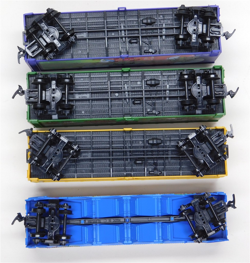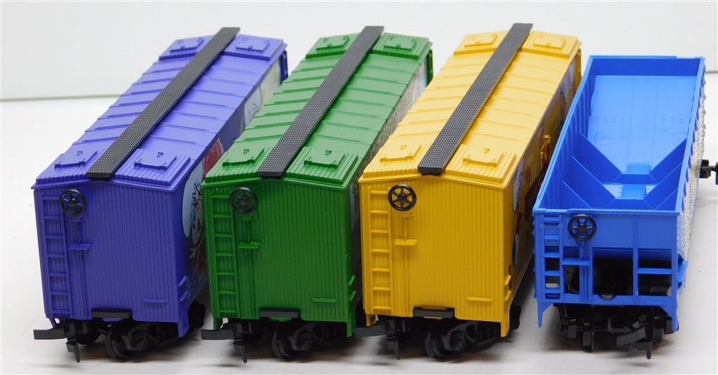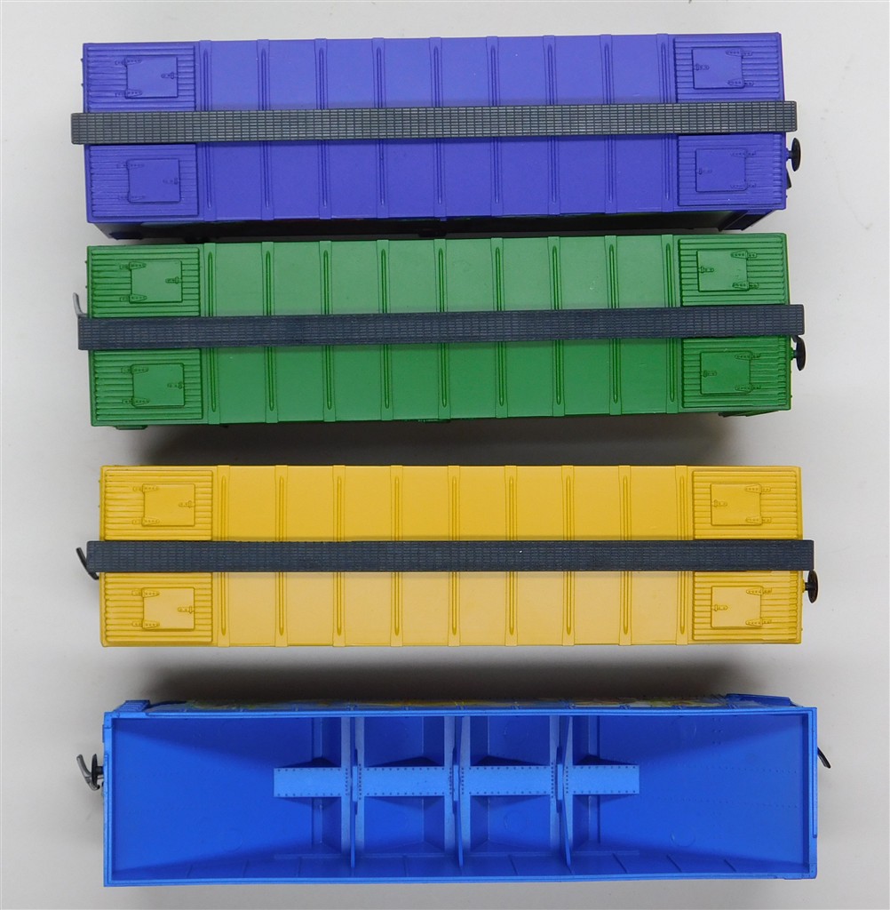 American H0: 3 Mehano H0 scale box cars and a hopper car from a set with horn-hook couplings