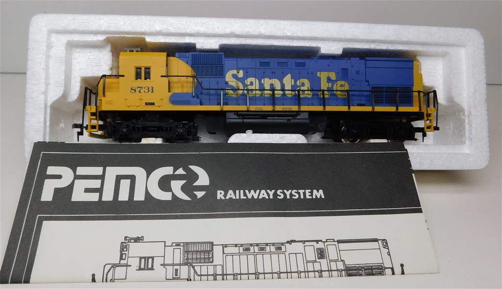 A Pemco 3302-001 Alco 430 diesel loco Santa Fe number 8731, noisy runner with working directional headlights, would benefit from careful lubrication, in good condition, supplied in the original box with instructions, horn-hook couplings