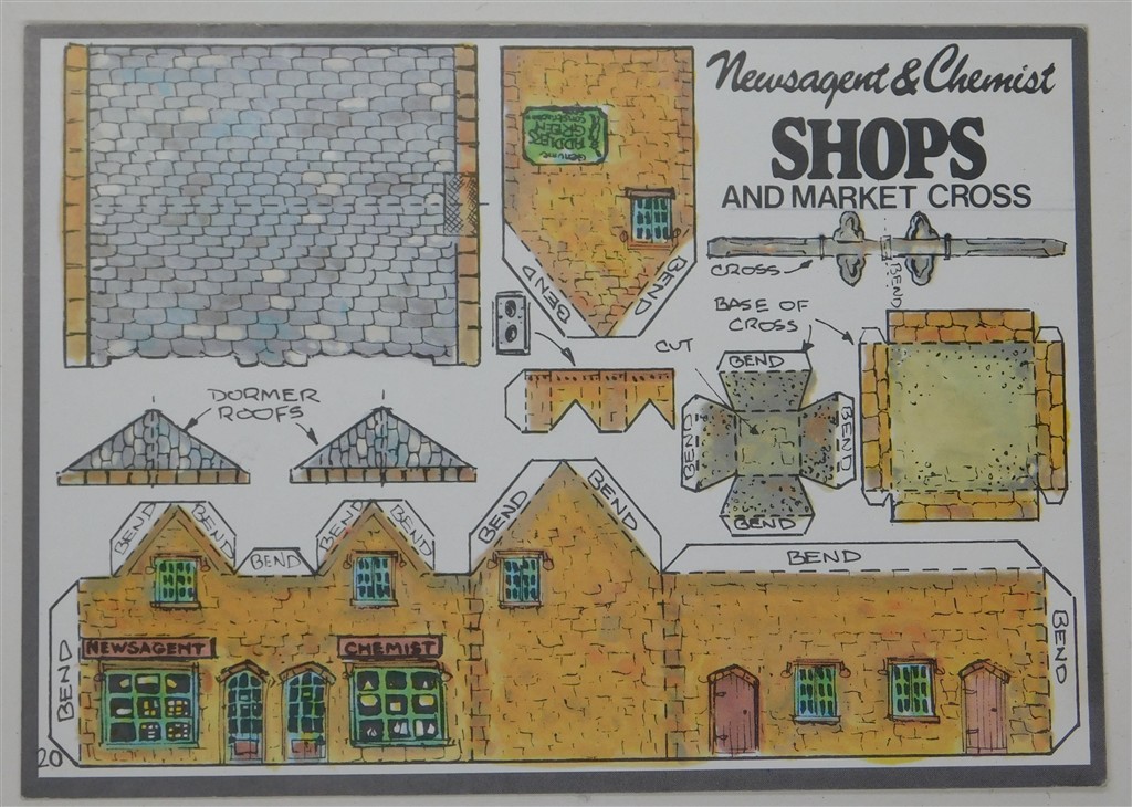 British N gauge: Fiddler's Green approximate N scale Newsagent & Chemist Shops and Market Cross cardboard kit