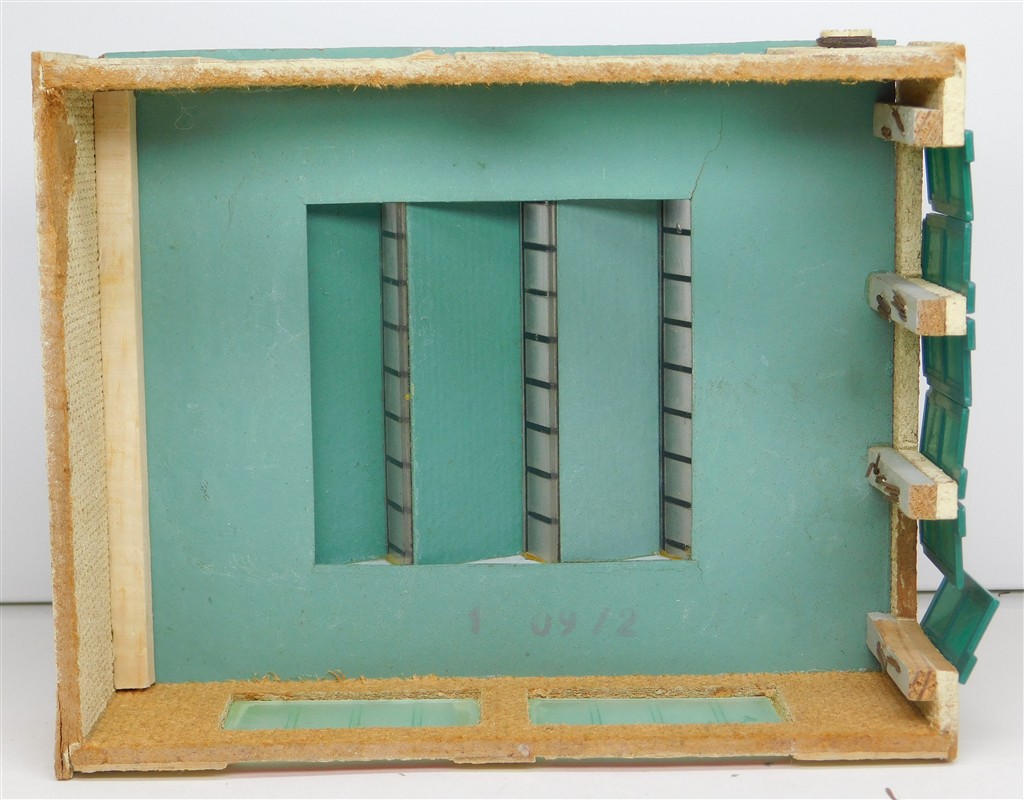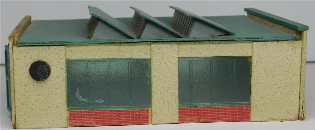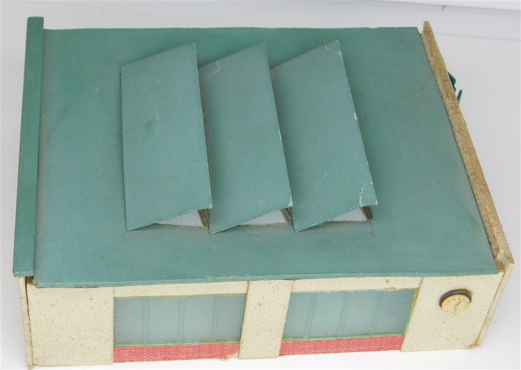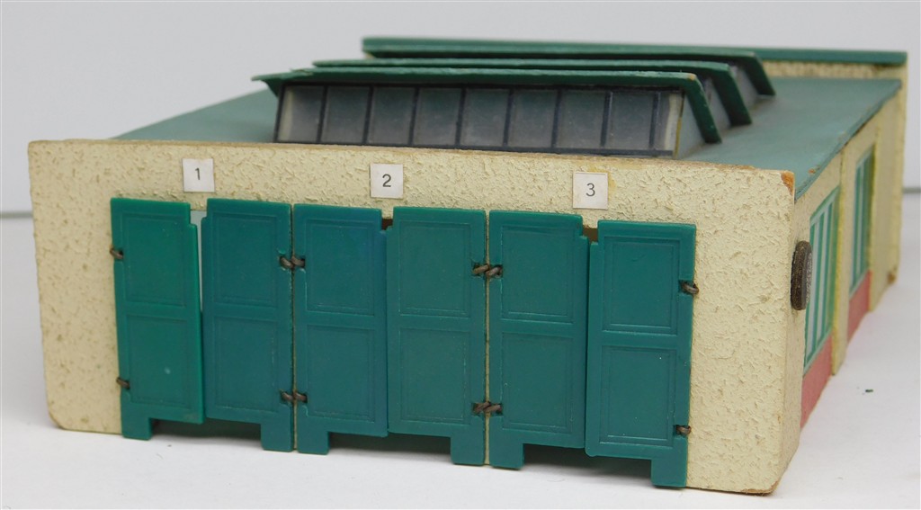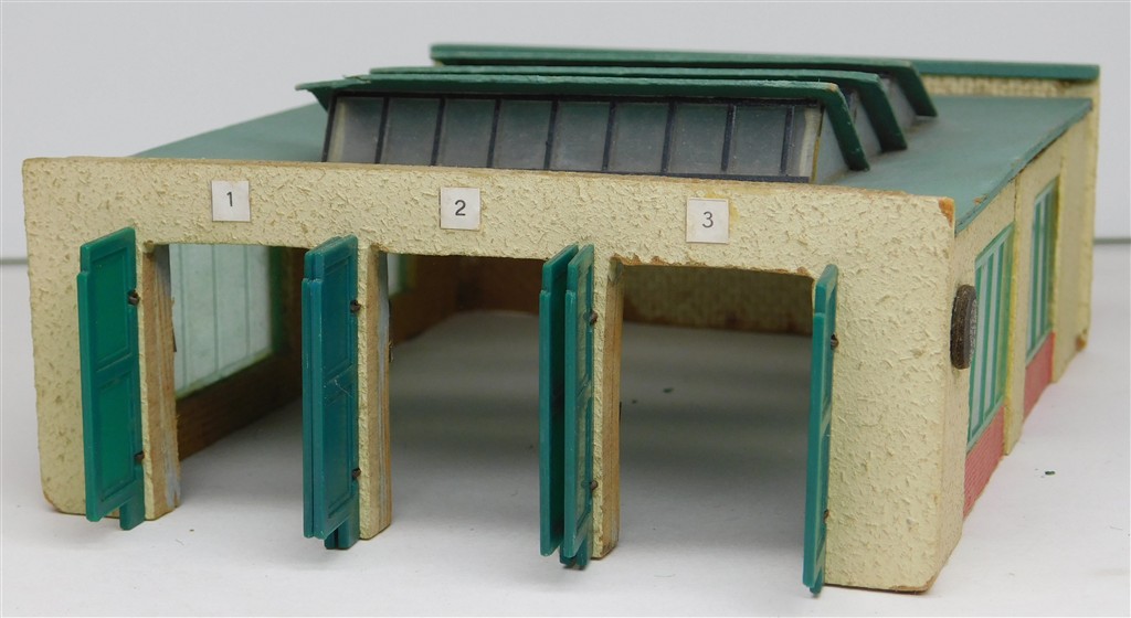 A Temos N gauge German assembled wooden 3 track diesel loco shed, made from hardboard in East Germany, opening doors, in good condition, no original box