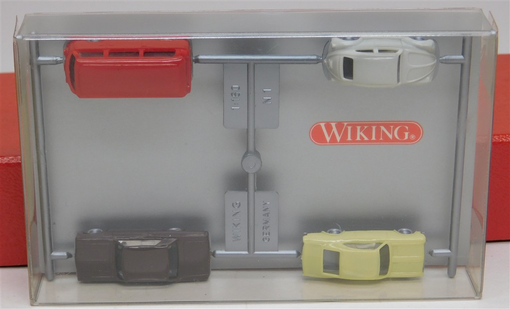 A Wiking 90910 N gauge set of 4 vehicles: VW1300 + Kombi - Rekord - Chevrolet, still attached to the sprue, supplied in the original box