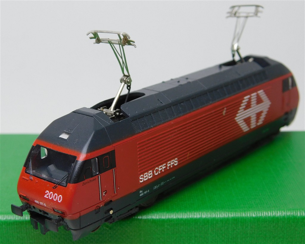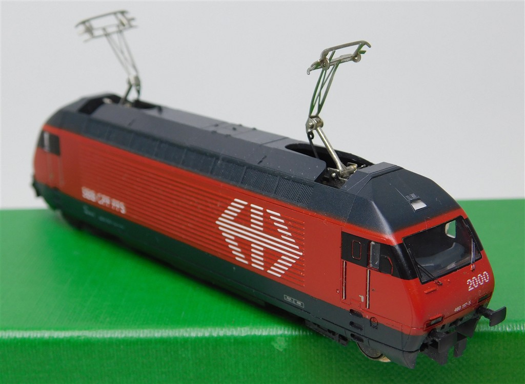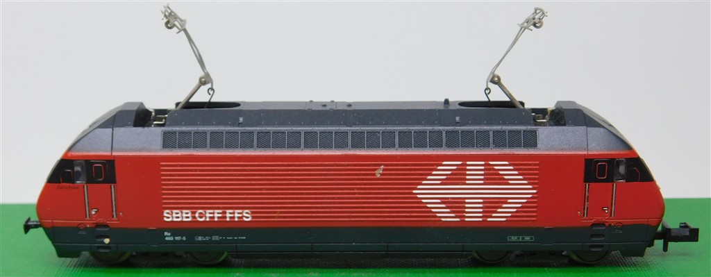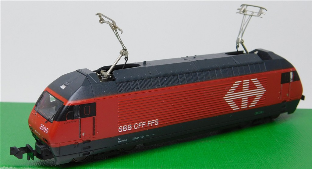 European N gauge: Minitrix 12523 N gauge Swiss Re460 electric loco 460 117-5, good runner, pantographs always up, missing buffers