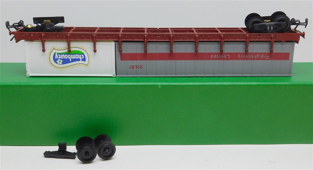A Jouef container wagon with broken bogie, all parts present, apart from the broken bogie in good condition, no original box